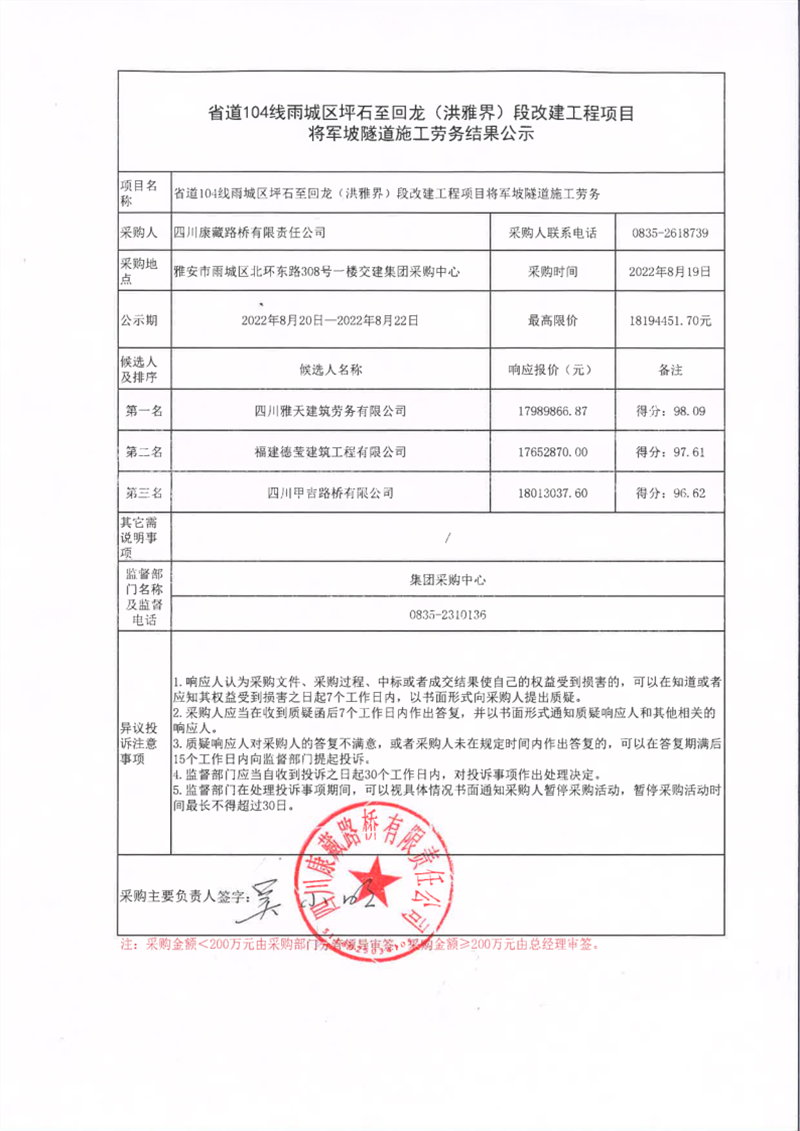 四川康藏路橋有限責任公司省道104線雨城區(qū)坪石至回龍(洪雅界)段改建工程項目將軍坡隧道施工勞務結果公示