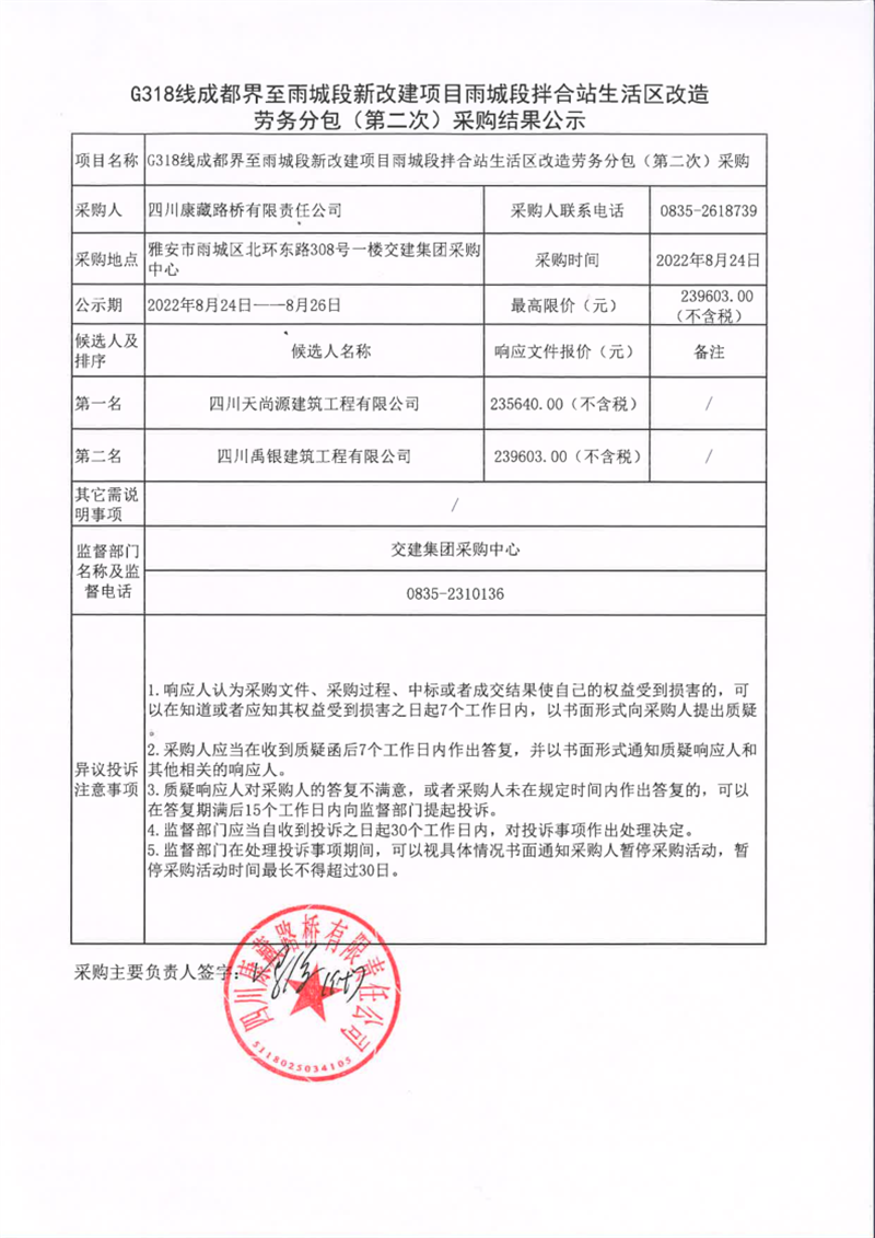四川康藏路橋有限責任公司G318線成都界至雨城段新改建項目雨城段拌合站生活區(qū)改造勞務(wù)分包(第二次)采購結(jié)果公示