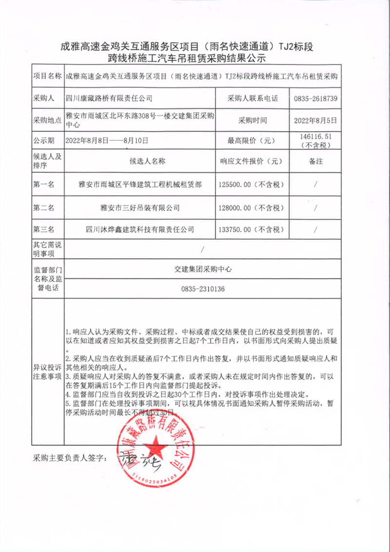 四川康藏路橋有限責任公司成雅高速金雞關(guān)互通服務區(qū)項目(雨名快速通道)TJ2標段跨線橋施工汽車吊租賃采購結(jié)果公示