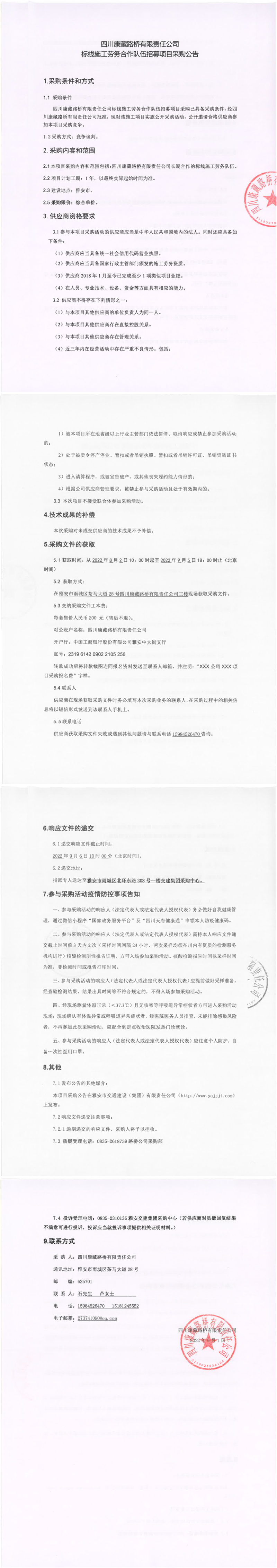 四川康藏路橋有限責(zé)任公司標(biāo)線施工勞務(wù)合作隊(duì)伍招募項(xiàng)目采購公告