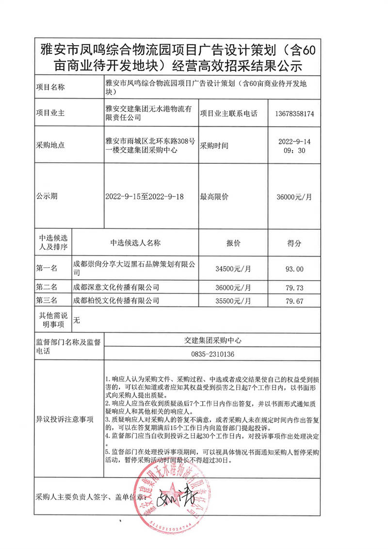 雅安交建集團(tuán)無水港物流有限責(zé)任公司雅安市鳳鳴綜合物流園項(xiàng)目廣告設(shè)計(jì)策劃(含60畝商業(yè)待開發(fā)地塊)經(jīng)營(yíng)高效招采結(jié)果公示