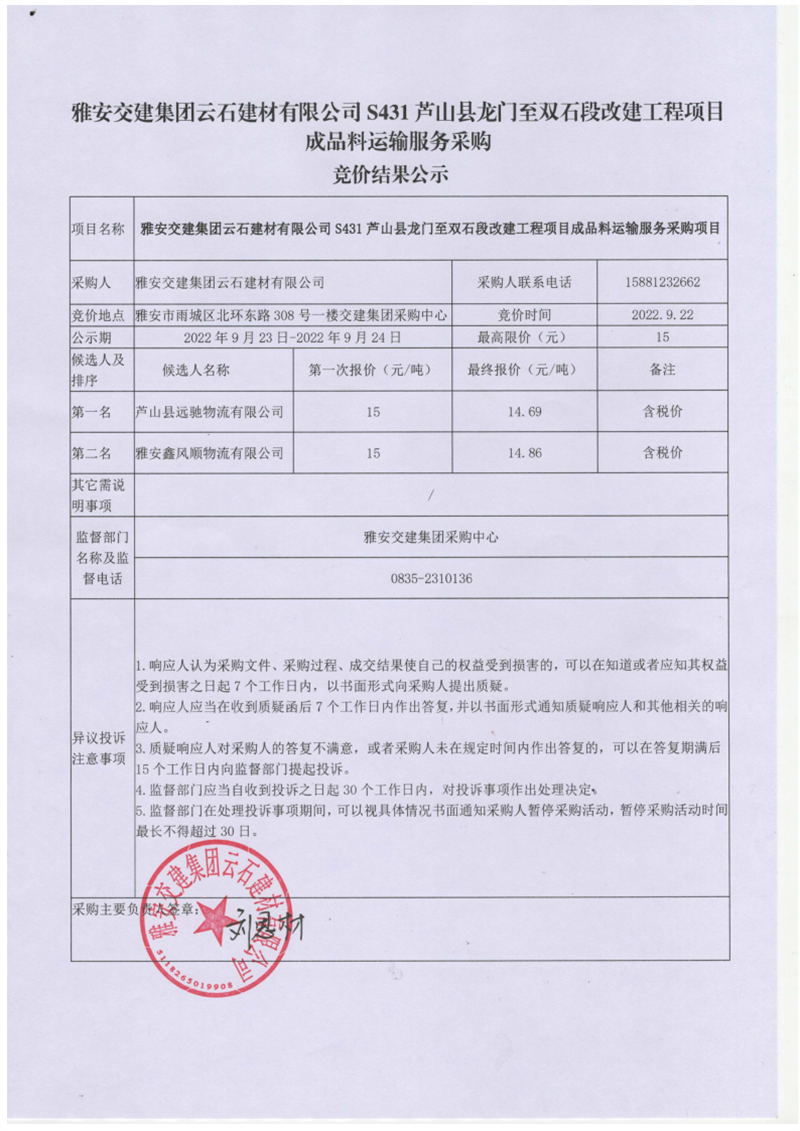 雅安交建集團云石建材有限公司S431蘆山縣龍門至雙石段改建工程項目成品料運輸服務采購競價結(jié)果公示