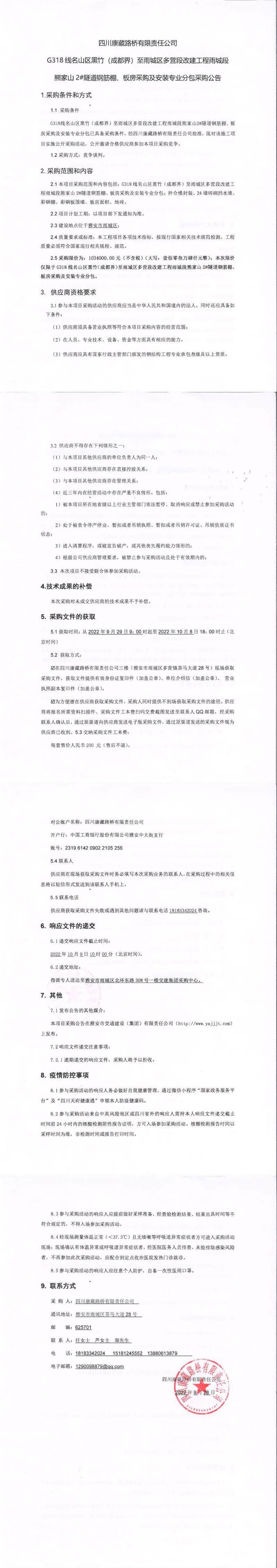 四川康藏路橋有限責(zé)任公司G318線(xiàn)名山區(qū)黑竹(成都界)至雨城區(qū)多營(yíng)段改建工程雨城段熊家山2#隧道鋼筋棚、板房采購(gòu)及安裝專(zhuān)業(yè)分包采購(gòu)公告