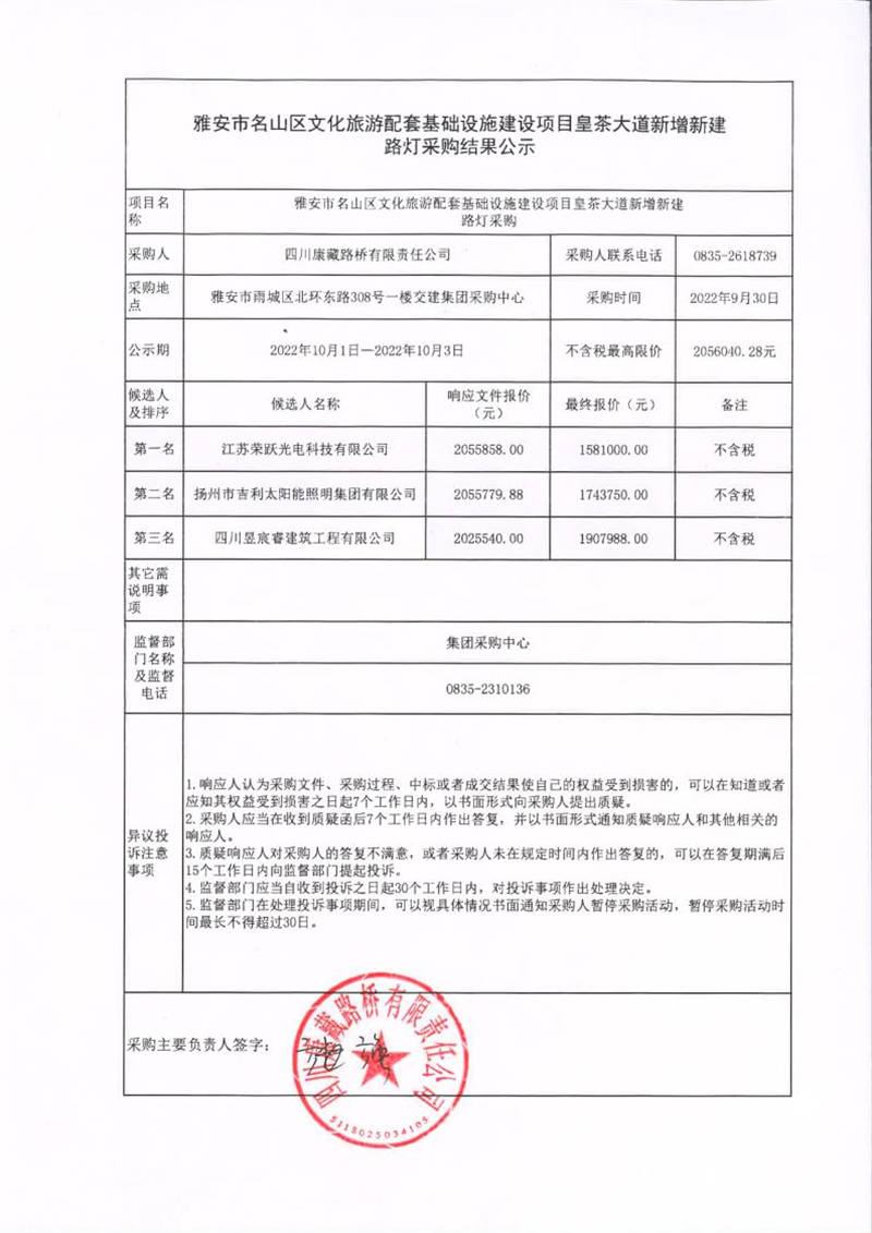 四川康藏路橋有限責(zé)任公司雅安市名山區(qū)文化旅游配套基礎(chǔ)設(shè)施建設(shè)項(xiàng)目皇茶大道新增新建路燈采購(gòu)結(jié)果公示