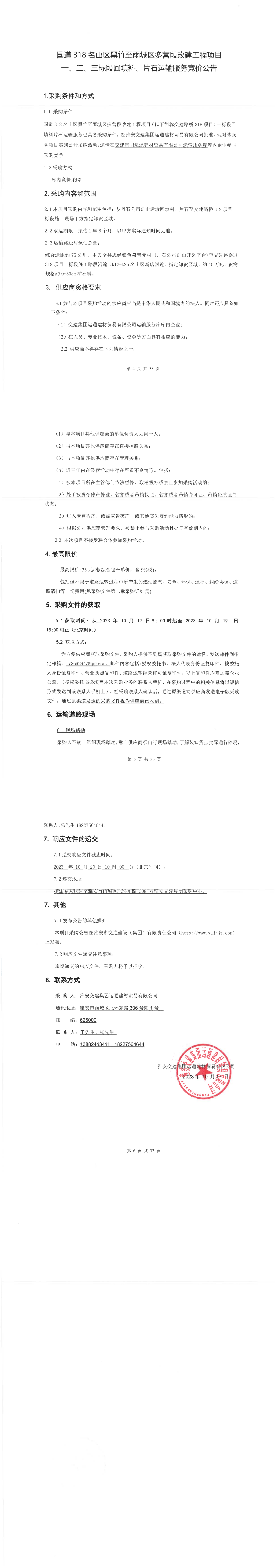 雅安交建集團(tuán)運(yùn)通建材貿(mào)易有限公司國(guó)道名山區(qū)黑竹至雨城區(qū)多營(yíng)段改建工程項(xiàng)目一、二、三標(biāo)段回填料、片石運(yùn)輸服務(wù)競(jìng)價(jià)公告