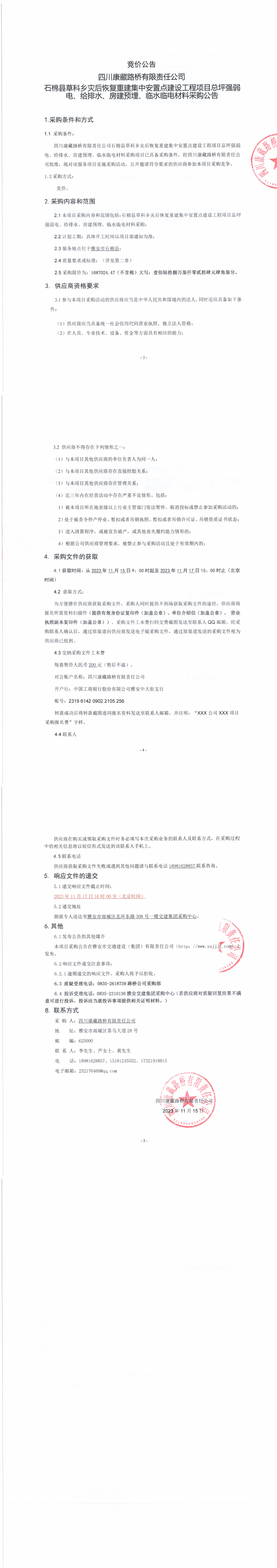 四川康藏路橋有限責任公司石棉縣草科鄉(xiāng)災后恢復重建集中安置點建設工程項目總坪強弱電、給排水、房建預埋、臨水臨電材料采購公告