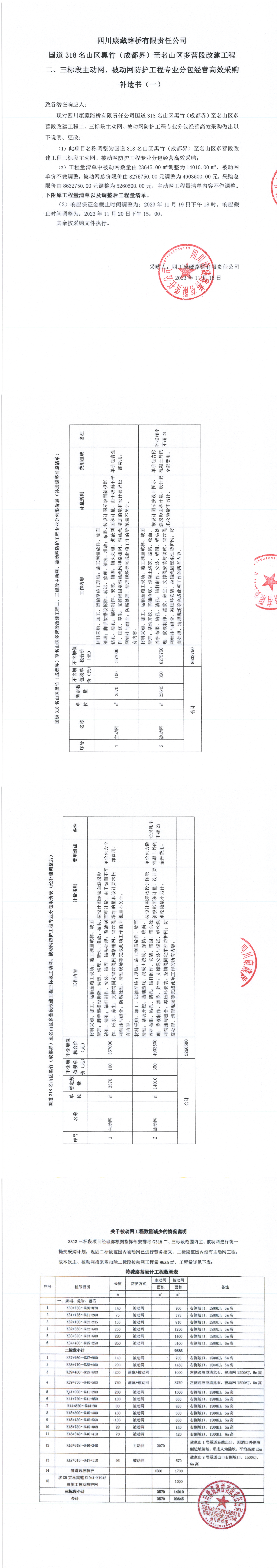 四川康藏路橋有限責(zé)任公司國道318名山區(qū)黑竹(成都界)至名山區(qū)多營段改建工程二、三標段主動網(wǎng)、被動網(wǎng)防護工程專業(yè)分包經(jīng)營高效采購補遺書(一)