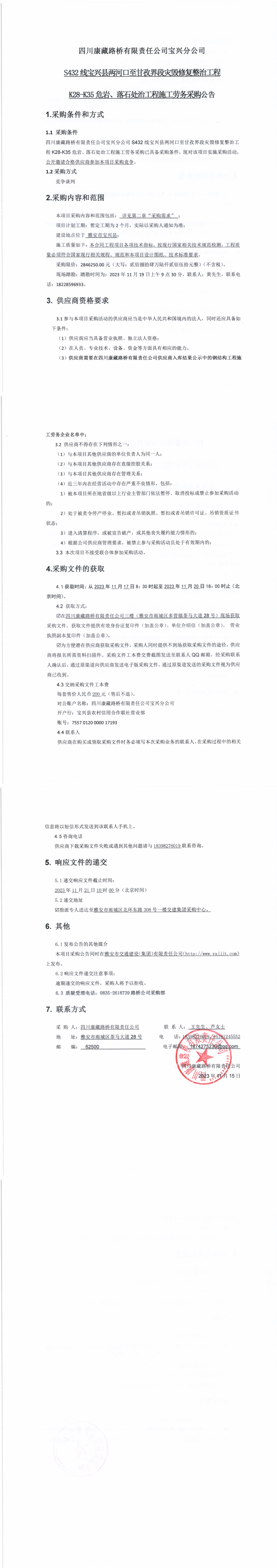 四川康藏路橋有限責任公司寶興分公司S432線寶興縣兩河口至甘孜界段災毀修復整治工程K28-K35危巖、落石處治工程施工勞務采購公告