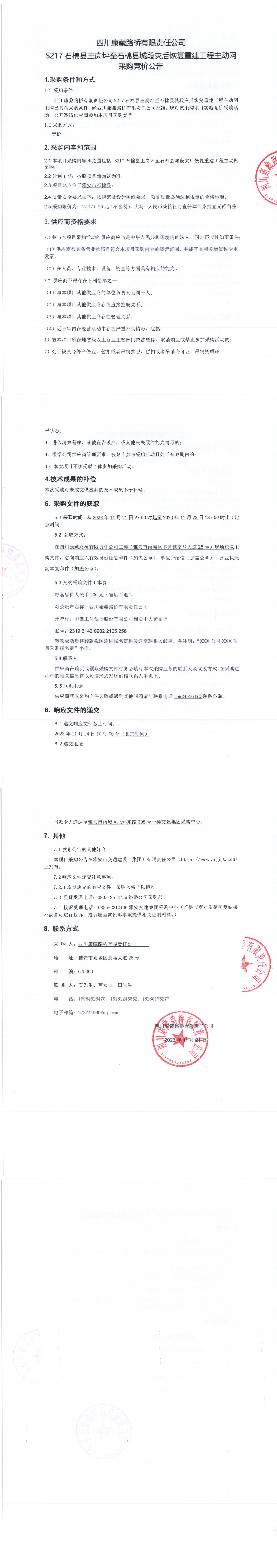 四川康藏路橋有限責任公司S217石棉縣王崗坪至石棉縣城段災后恢復重建工程主動網采購公告