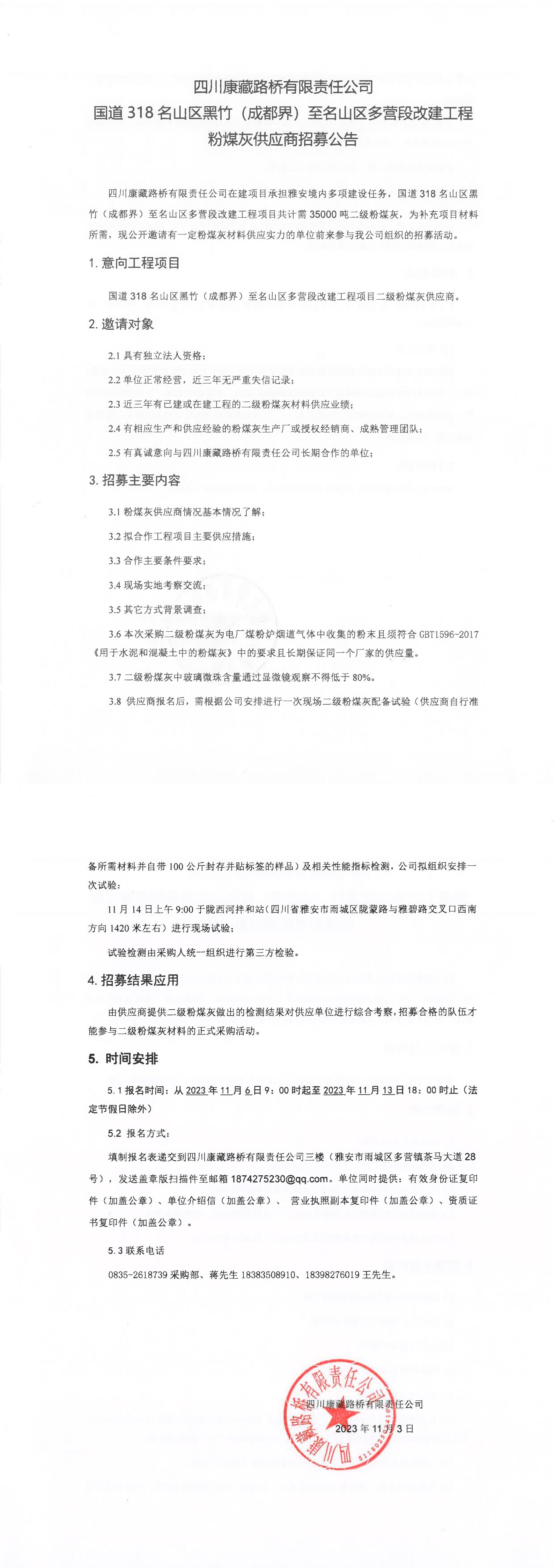 四川康藏路橋有限責(zé)任公司國道318名山區(qū)黑竹(成都界)至名山區(qū)多營段改建工程粉煤灰供應(yīng)商招募公告