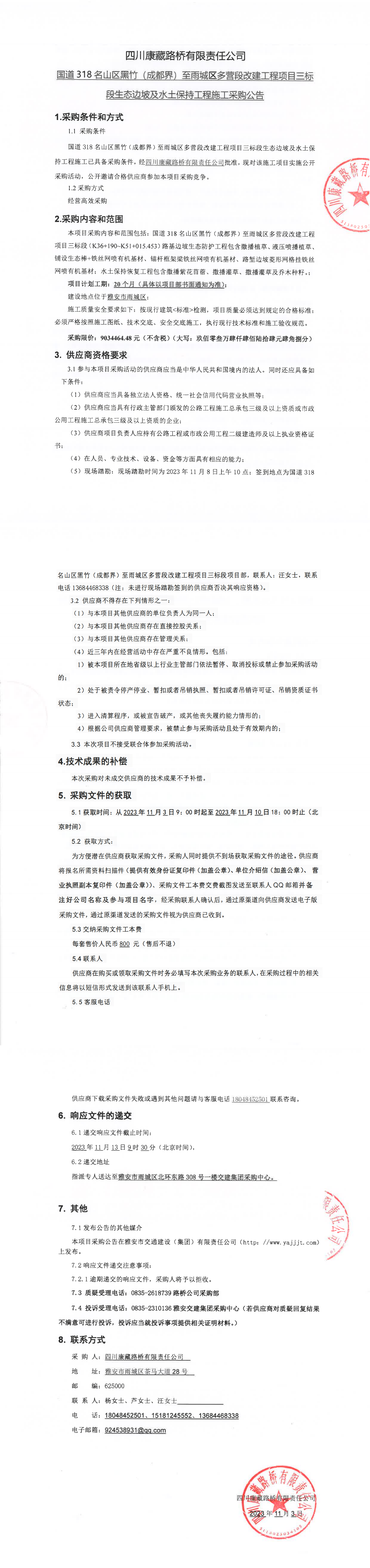 四川康藏路橋有限責(zé)任公司國道318名山區(qū)黑竹(成都界)至雨城區(qū)多營段改建工程項(xiàng)目三標(biāo)段生態(tài)邊坡及水土保持工程施工采購公告