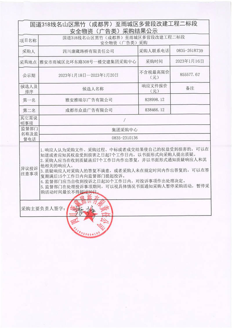 四川康藏路橋有限責(zé)任公司國道318線名山區(qū)黑竹(成都界)至雨城區(qū)多營段改建工程二標段安全物資(廣告類)采購結(jié)果公示