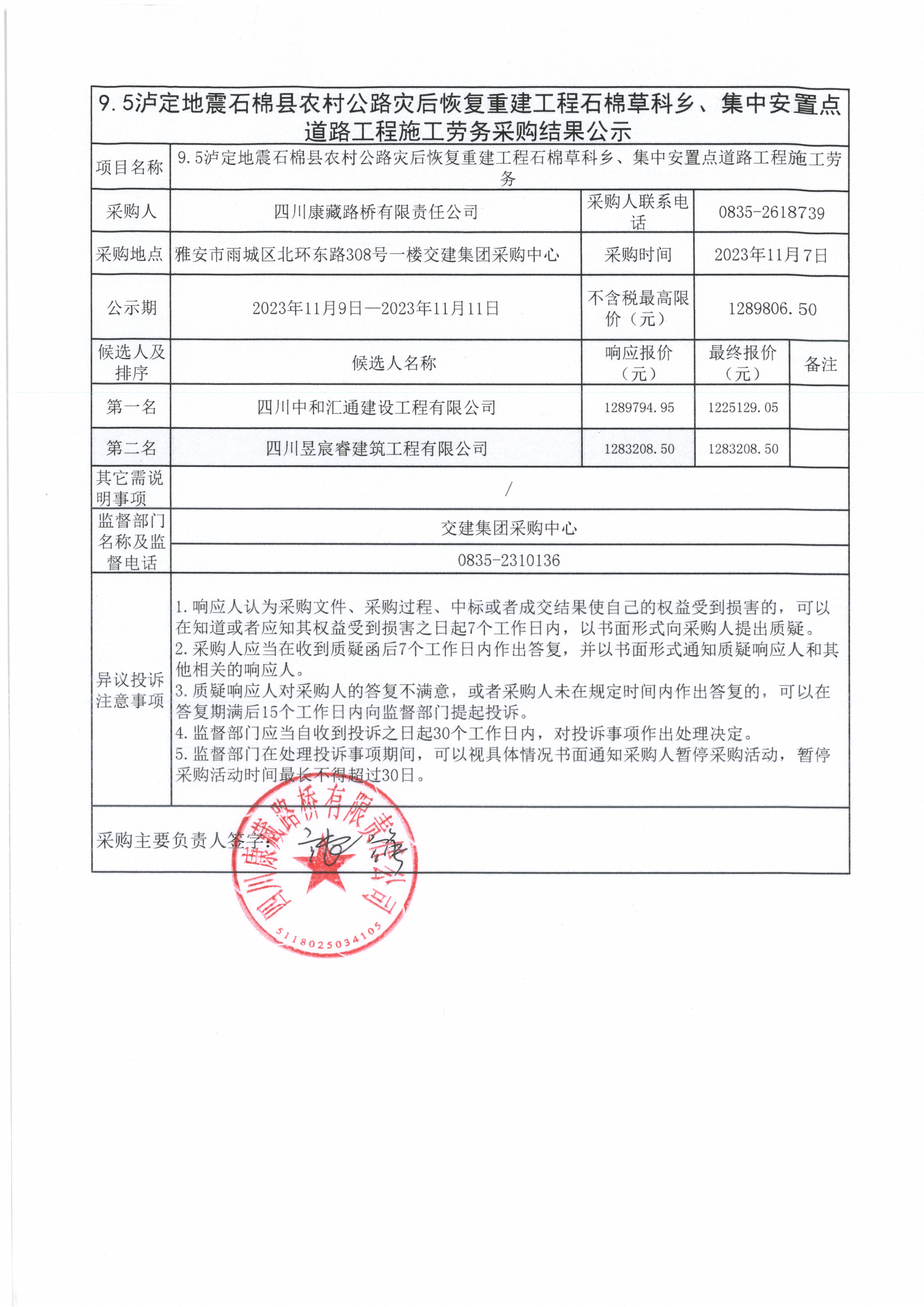 四川康藏路橋有限責(zé)任公司9.5瀘定地震石棉縣農(nóng)村公路災(zāi)后恢復(fù)重建工程剩余工程土建工程施工勞務(wù)采購(gòu)結(jié)果公示