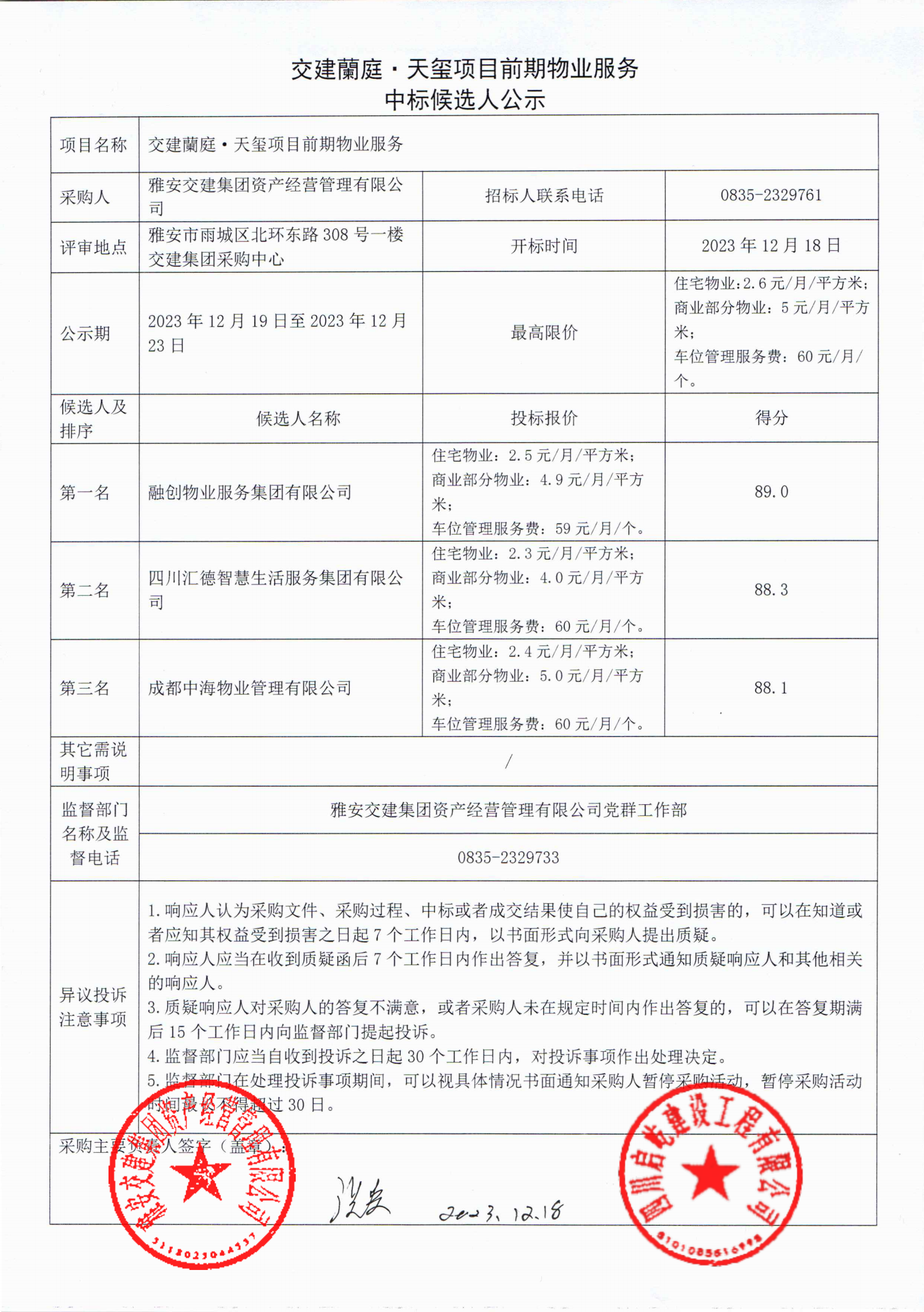 雅安交建集團(tuán)資產(chǎn)經(jīng)營管理有限公司交建蘭庭·天璽項目前期物業(yè)服務(wù)中標(biāo)候選人公示