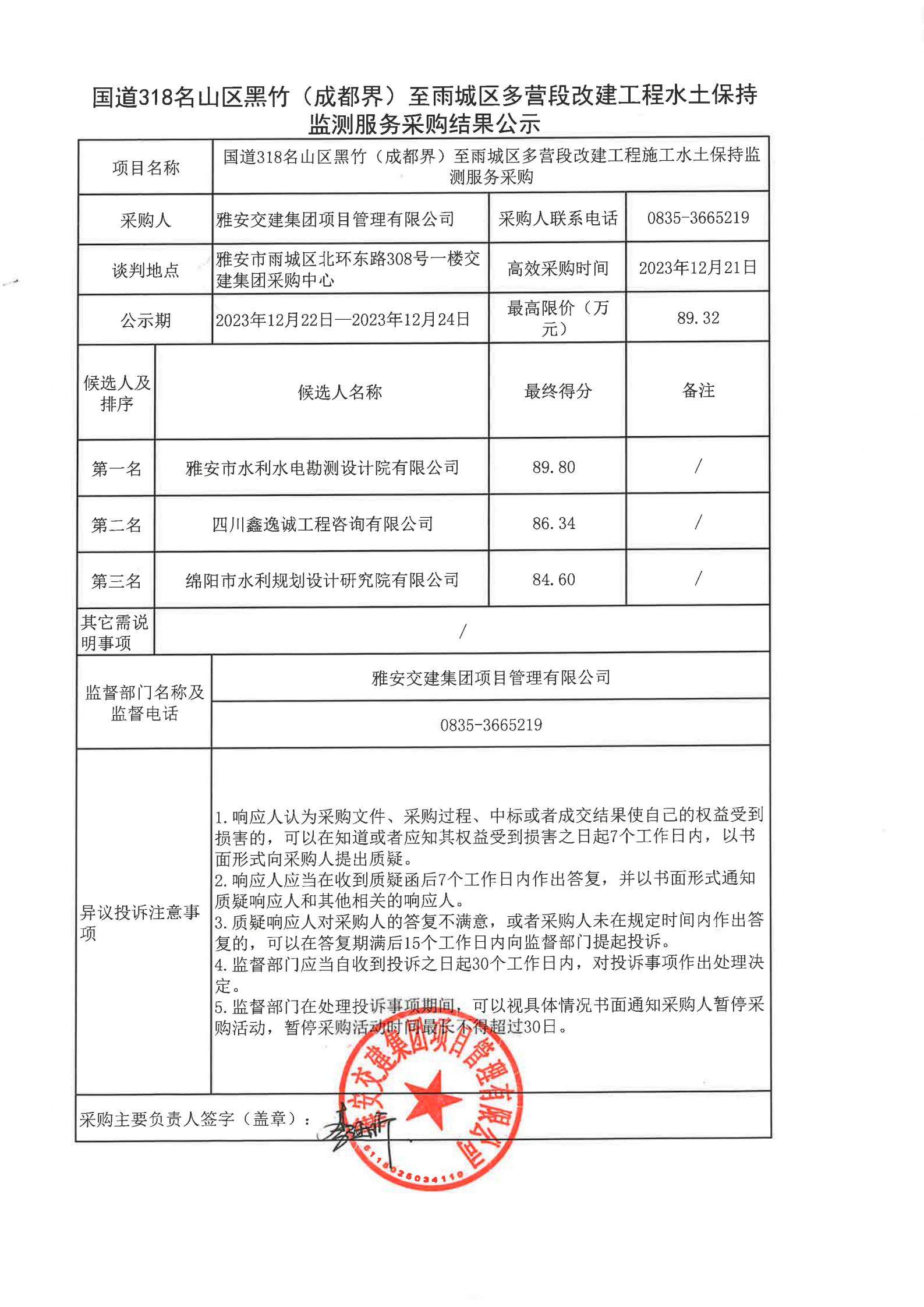 雅安交建集團項目管理有限公司國道318名山區(qū)黑竹(成都界)至雨城區(qū)多營段改建工程水土保持監(jiān)測服務(wù)采購結(jié)果公示