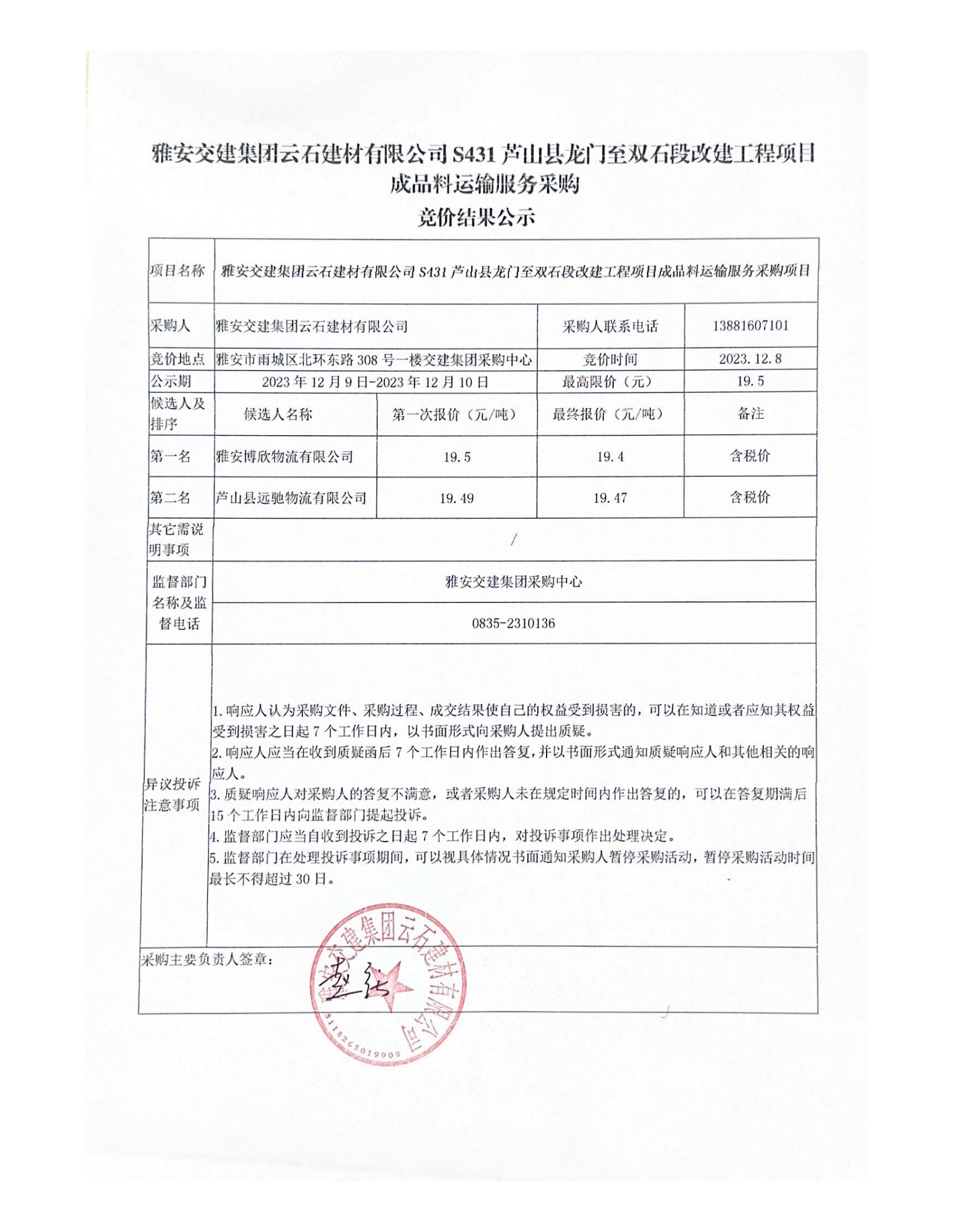 雅安交建集團(tuán)云石建材有限公司S431蘆山縣龍門至雙石段改建工程項目成品料運(yùn)輸服務(wù)采購競價結(jié)果公示
