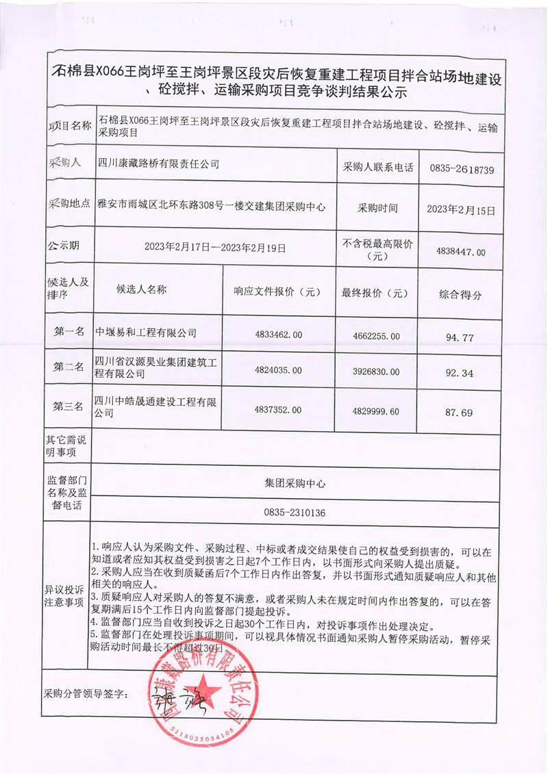 四川康藏路橋有限責任公司石棉縣X066王崗坪至王崗坪景區(qū)段災(zāi)后恢復(fù)重建工程項目拌合站場地建設(shè)、砼攪拌、運輸采購項目競爭談判結(jié)果公示