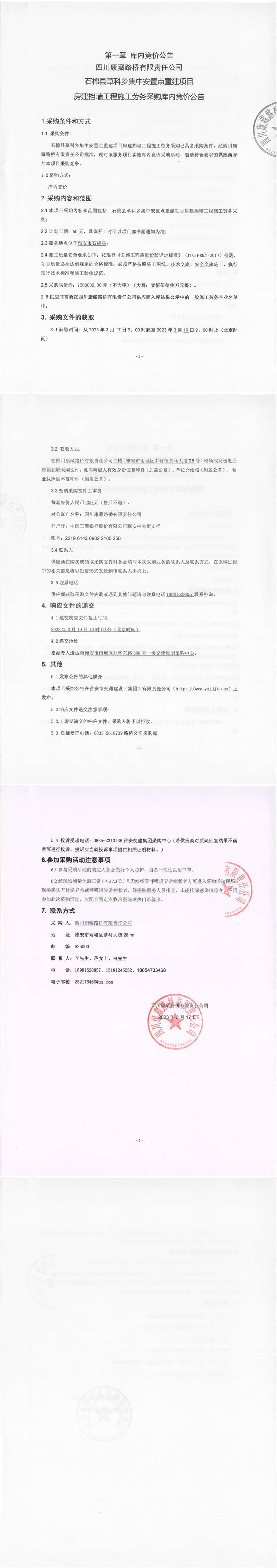 四川康藏路橋有限責(zé)任公司石棉草科鄉(xiāng)集中安置點(diǎn)重建項(xiàng)目房建擋墻工程施工勞務(wù)采購庫內(nèi)競(jìng)價(jià)公告
