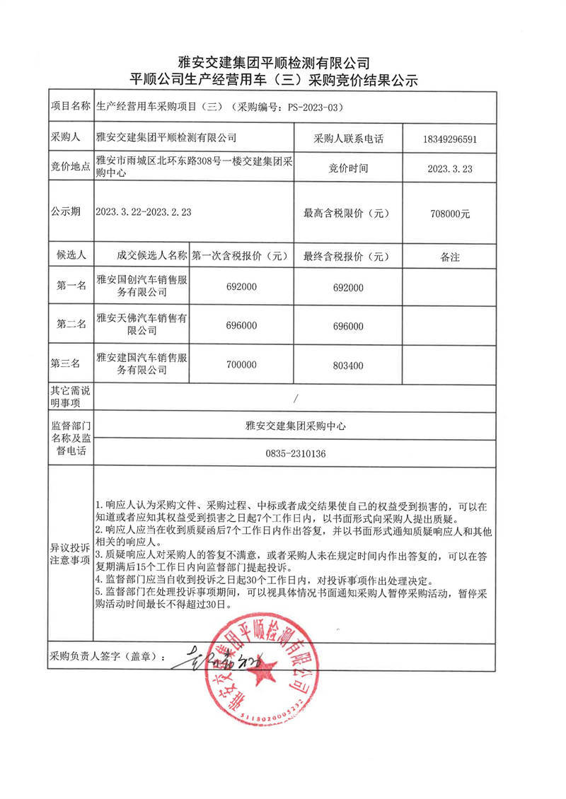 雅安交建集團平順檢測有限公司平順公司生產(chǎn)經(jīng)營用車(二)采購競價結果公示