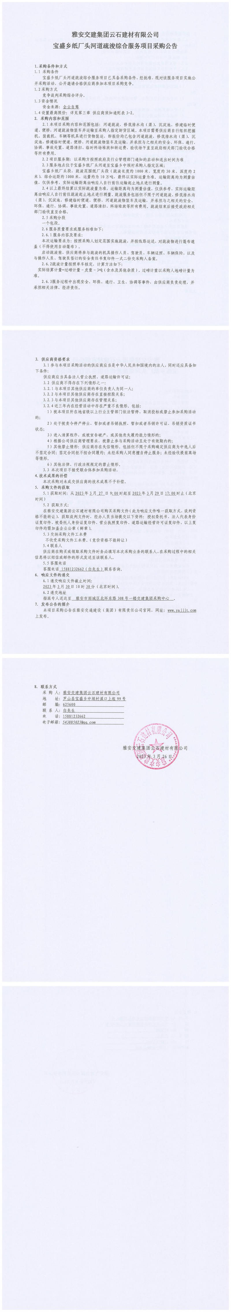 雅安交建集團云石建材有限公司寶盛鄉(xiāng)紙廠頭河道疏浚綜合服務項目采購公告