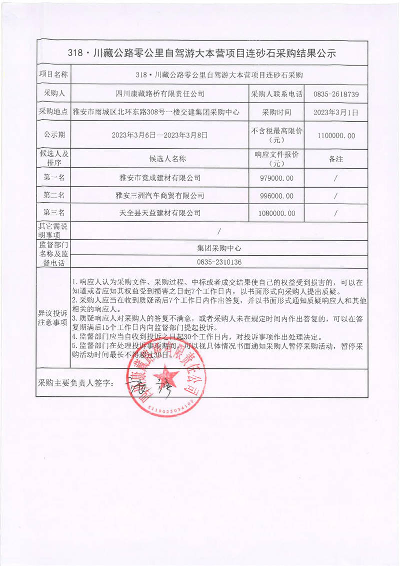 四川康藏路橋有限責(zé)任公司國(guó)道318名山區(qū)黑竹(成都界)至雨城區(qū)多營(yíng)段改建工程物資采購(gòu)(包件1)結(jié)果公示