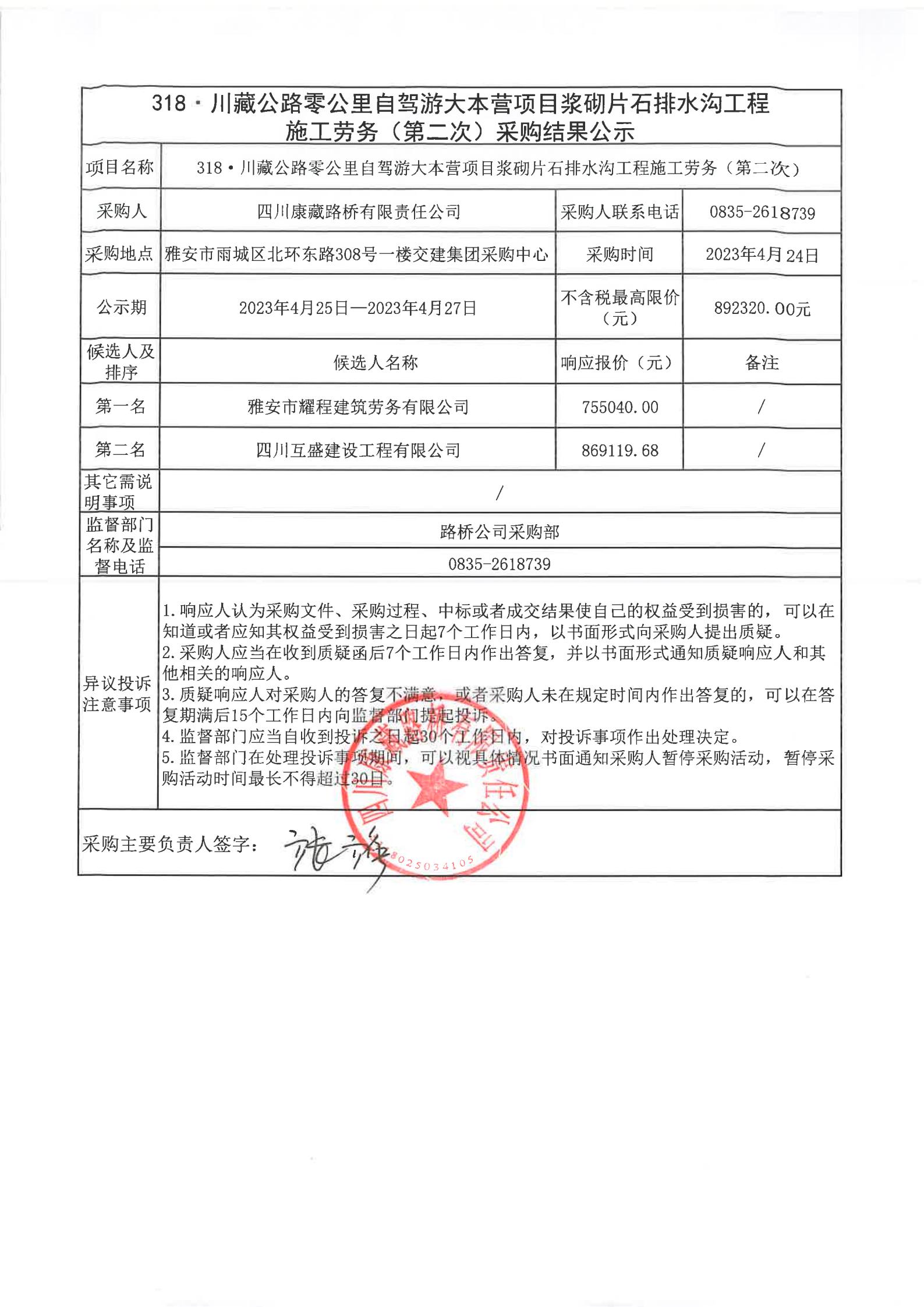 四川康藏路橋有限責任公司318·川藏公路零公里自駕游大本營項目漿砌片石排水溝工程施工勞務(第二次)采購結果公示