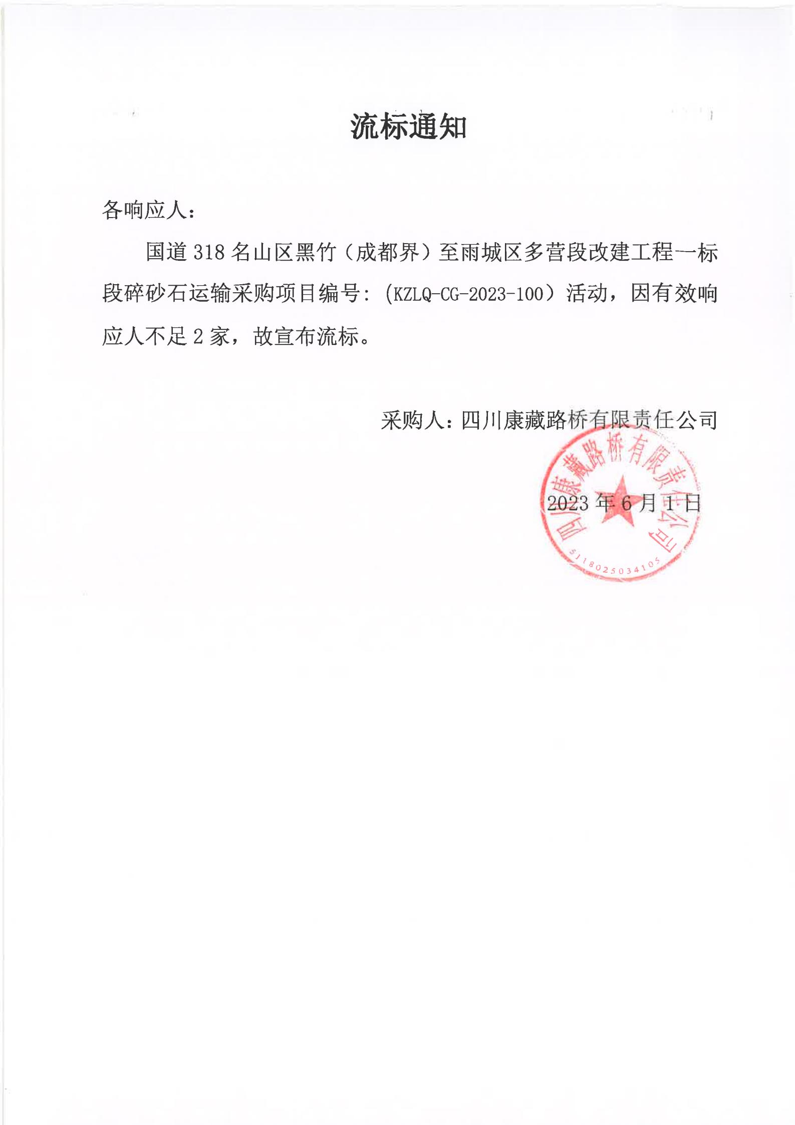 四川康藏路橋有限責(zé)任公司國(guó)道318名山區(qū)黑竹(成都界)至雨城區(qū)多營(yíng)段改建工程一標(biāo)段碎砂石運(yùn)輸采購(gòu)流標(biāo)通知