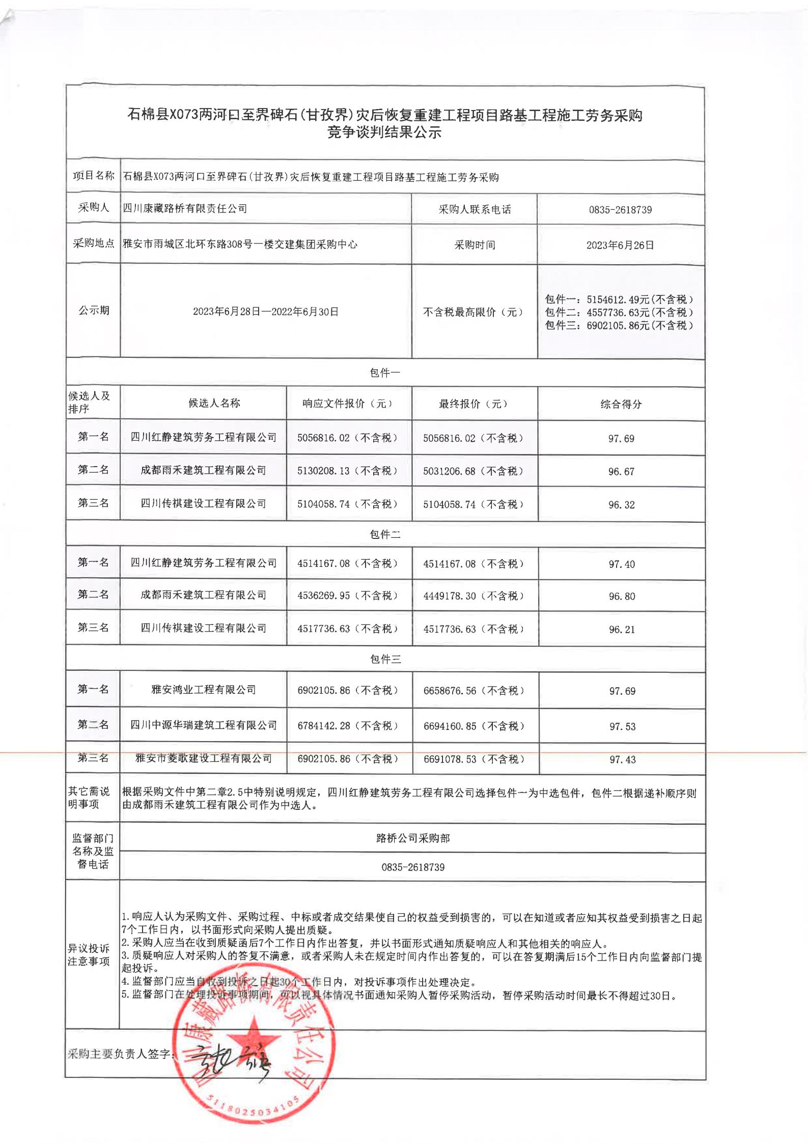 四川康藏路橋有限責(zé)任公司石棉縣X073兩河口至界碑石災(zāi)后恢復(fù)重建工程項(xiàng)目安全物資采購(gòu)項(xiàng)目競(jìng)爭(zhēng)談判結(jié)果公示