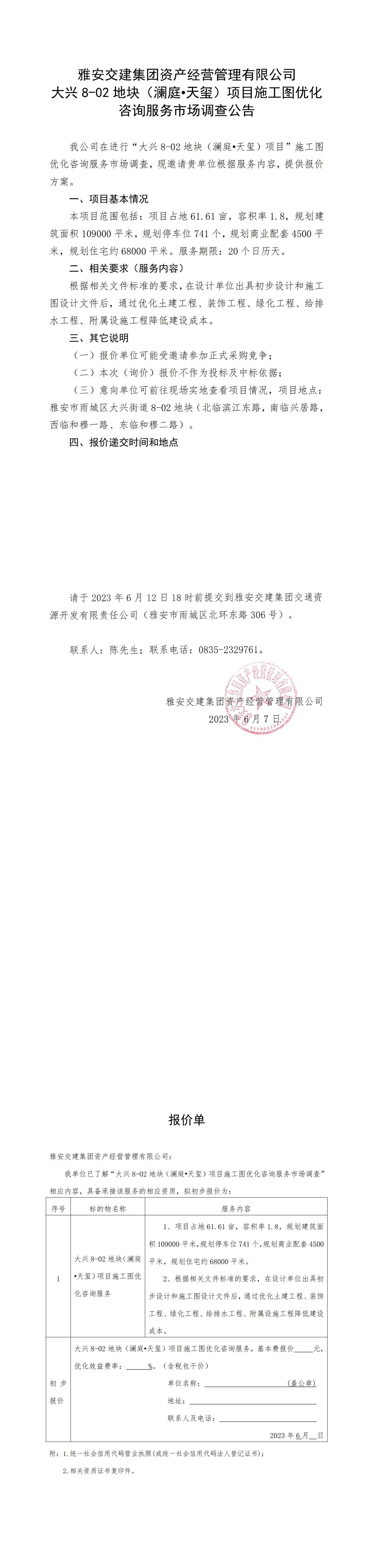 雅安交建集團資產經(jīng)營管理有限公司大興8-02地塊(瀾庭·天璽)項目施工圖優(yōu)化咨詢服務市場調查公告