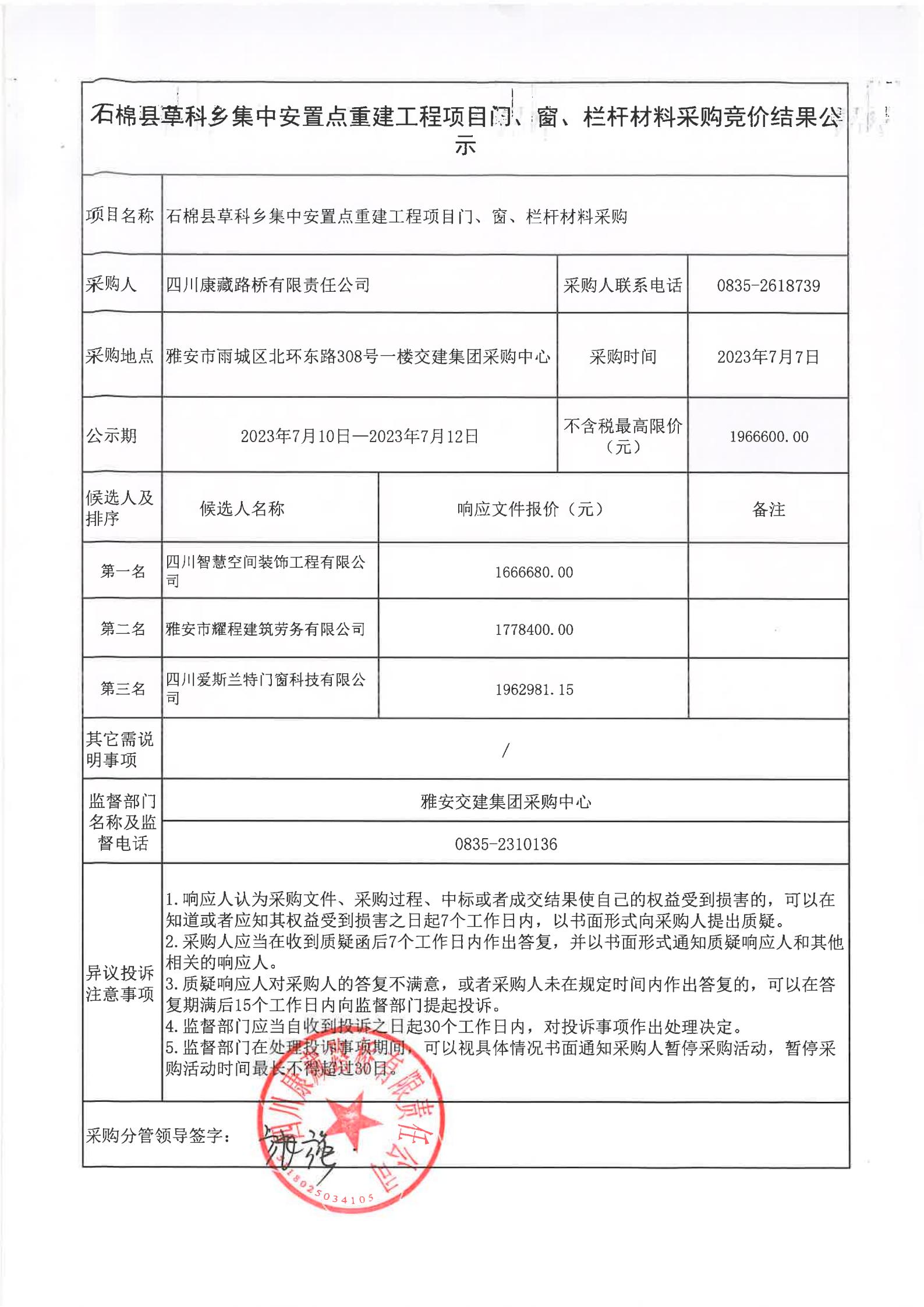 四川康藏路橋有限責(zé)任公司石棉草科鄉(xiāng)集中安置點(diǎn)重建工程項(xiàng)目門、窗、欄桿材料采購(gòu)競(jìng)價(jià)結(jié)果公示