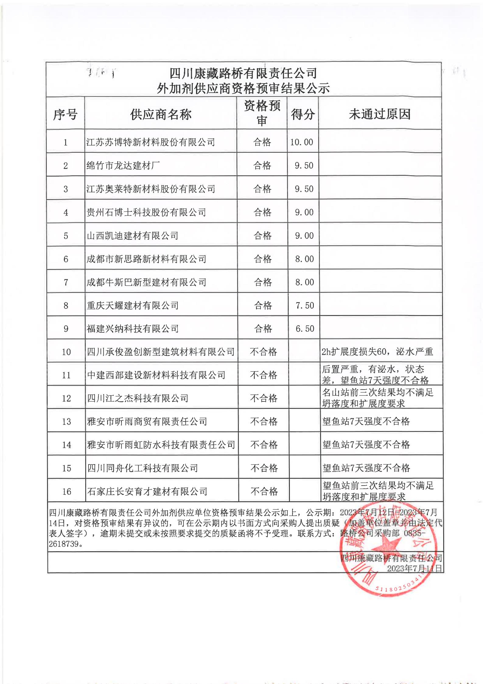 四川康藏路橋有限責任公司外加劑供應商資格預審結(jié)果公示