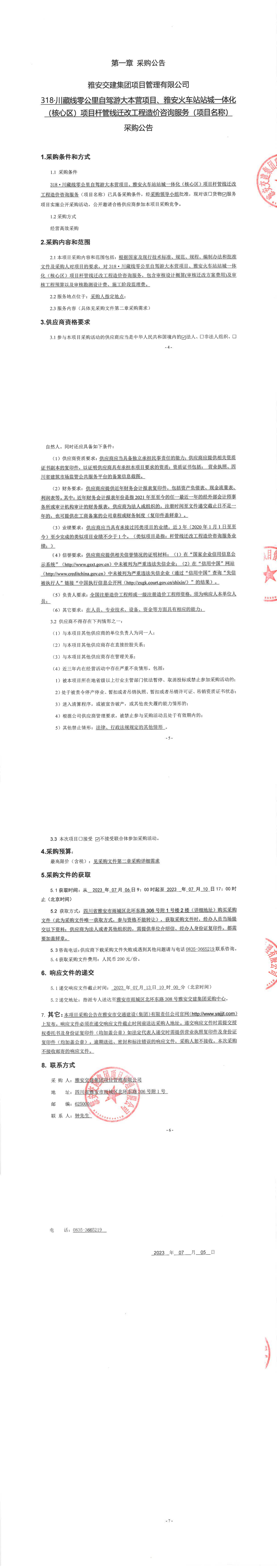 雅安交建集團項目管理有限公司318·川藏線零公里自駕大本營項目、雅安火車站站城一體化(核心區(qū))項目桿管線遷改工程造價咨詢服務(wù)(項目名稱)采購公告