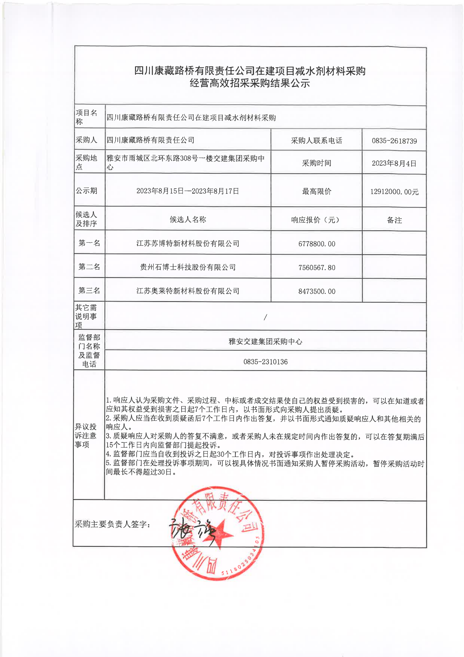 四川康藏路橋有限責(zé)任公司在建項(xiàng)目減水劑材料采購經(jīng)營(yíng)高效招采采購結(jié)果公示