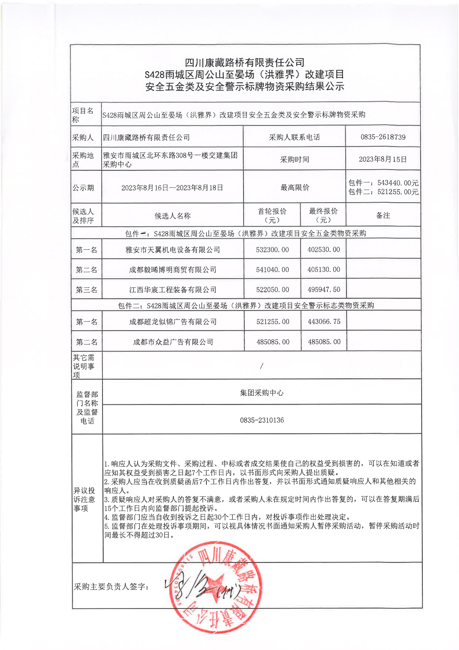 四川康藏路橋有限責(zé)任公司S428雨城區(qū)周公山至晏場(chǎng)(洪雅界)改建項(xiàng)目安全五金類及安全警示標(biāo)牌物資采購(gòu)結(jié)果公示