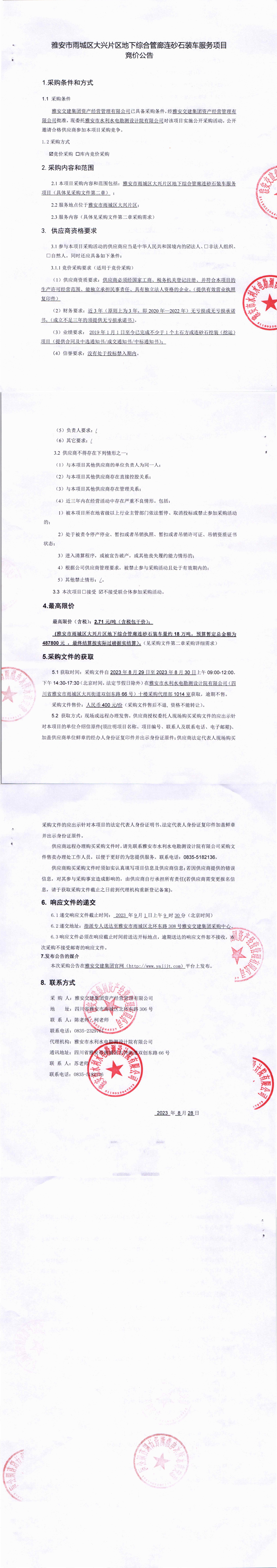 雅安交建集團(tuán)資產(chǎn)經(jīng)營管理有限公司雅安市雨城區(qū)大興片區(qū)地下綜合管廊連砂石裝車服務(wù)項(xiàng)目競價公告