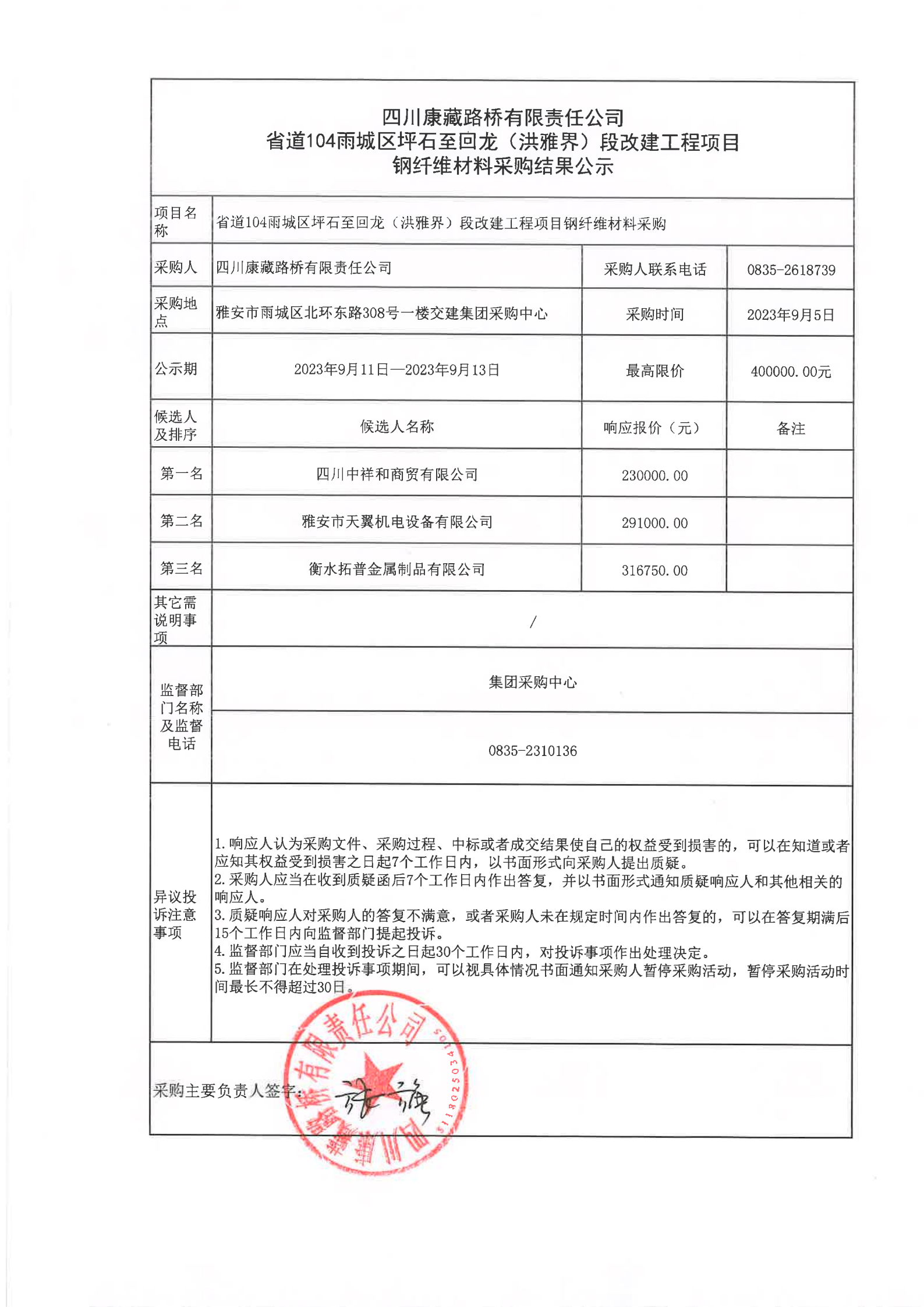 四川康藏路橋有限責(zé)任公司省道104雨城區(qū)坪石至回龍(洪雅界)段改建工程項(xiàng)目鋼纖維材料采購(gòu)結(jié)果公示