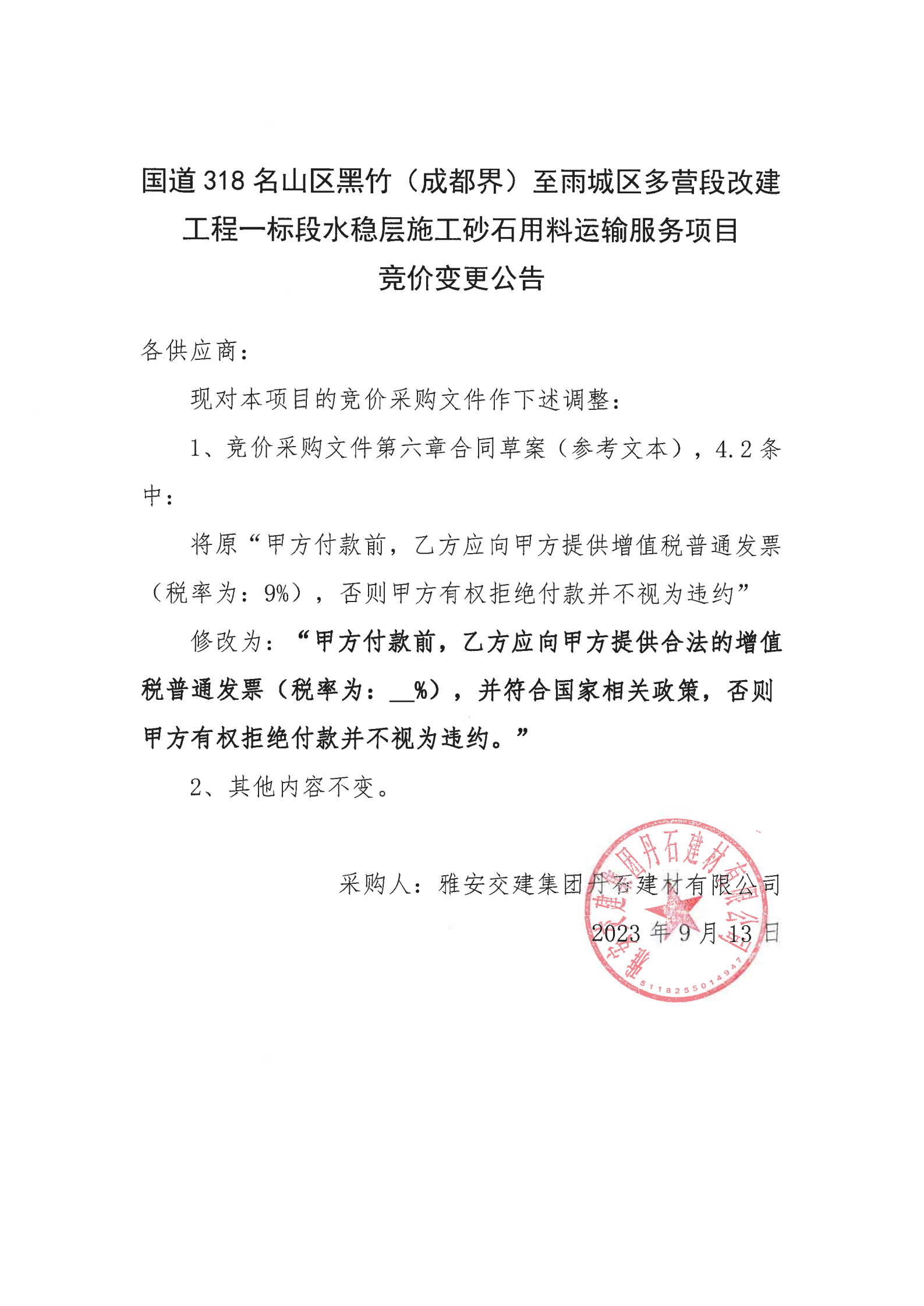 雅安交建集團丹石建材有限公司國道318名山區(qū)黑竹(成都界)至雨城區(qū)多營段改建工程一標(biāo)段水穩(wěn)層施工砂石用料運輸服務(wù)項目競價變更公告