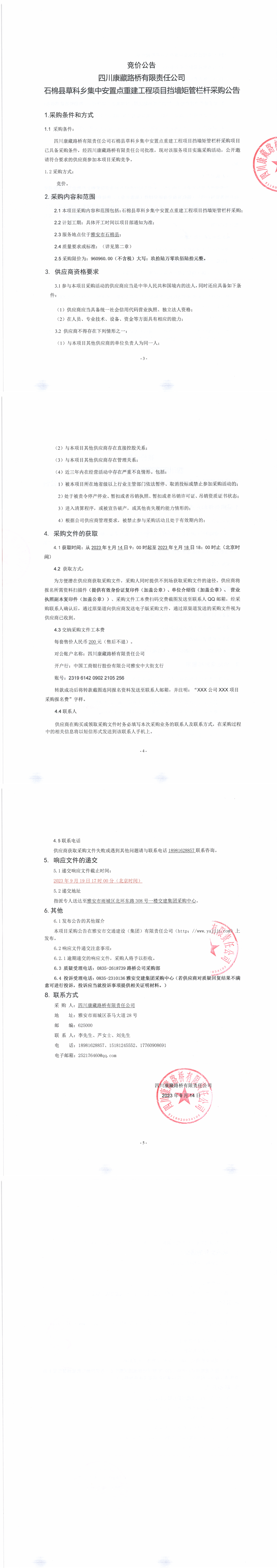 四川康藏路橋有限責(zé)任公司石棉縣草科鄉(xiāng)集中安置點(diǎn)重建工程項(xiàng)目擋墻矩管欄桿采購(gòu)公告