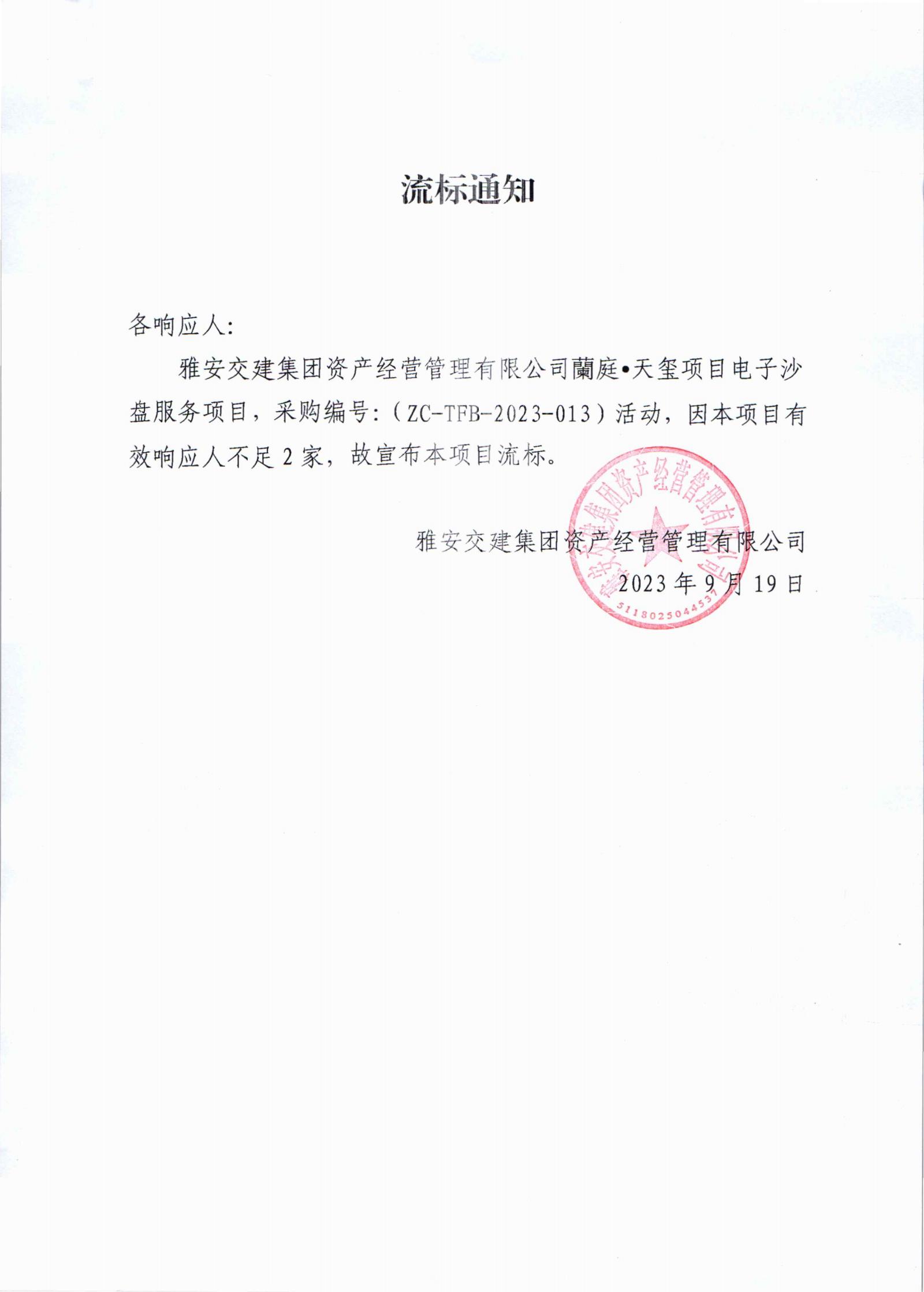雅安交建集團(tuán)資產(chǎn)經(jīng)營(yíng)管理有限公司蘭庭•天璽項(xiàng)目電子沙盤(pán)服務(wù)項(xiàng)目流標(biāo)通知書(shū)