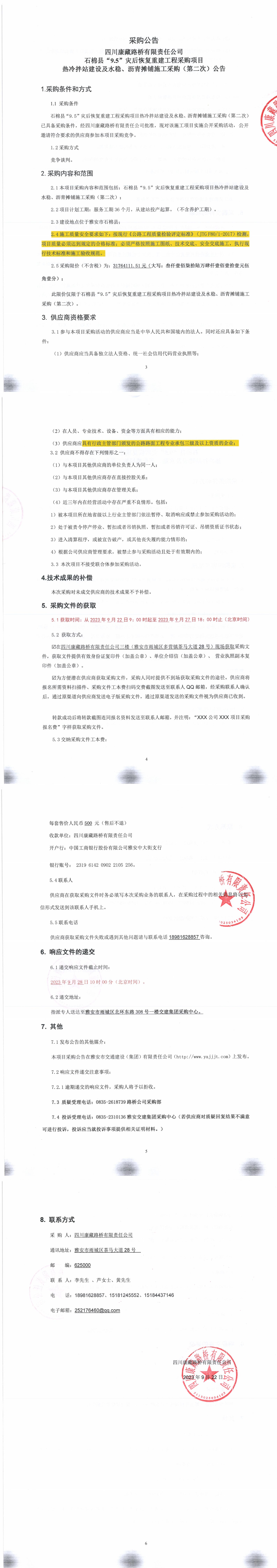 四川康藏路橋有限責(zé)任公司石棉縣“9·5”災(zāi)后恢復(fù)重建工程采購項目熱冷拌站建設(shè)及水穩(wěn)、瀝青攤鋪施工采購(第二次)公告