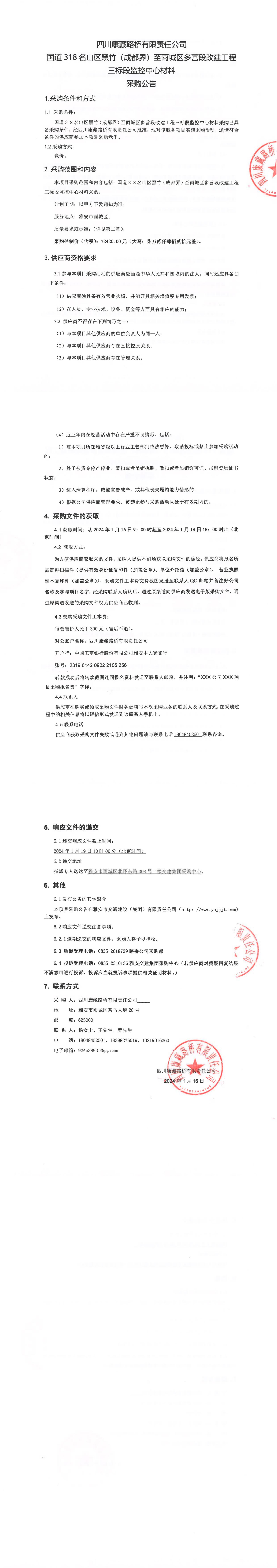 四川康藏路橋有限責(zé)任公司國(guó)道318名山區(qū)黑竹(成都界)至雨城區(qū)多營(yíng)段改建工程三標(biāo)段監(jiān)控中心材料采購(gòu)公告