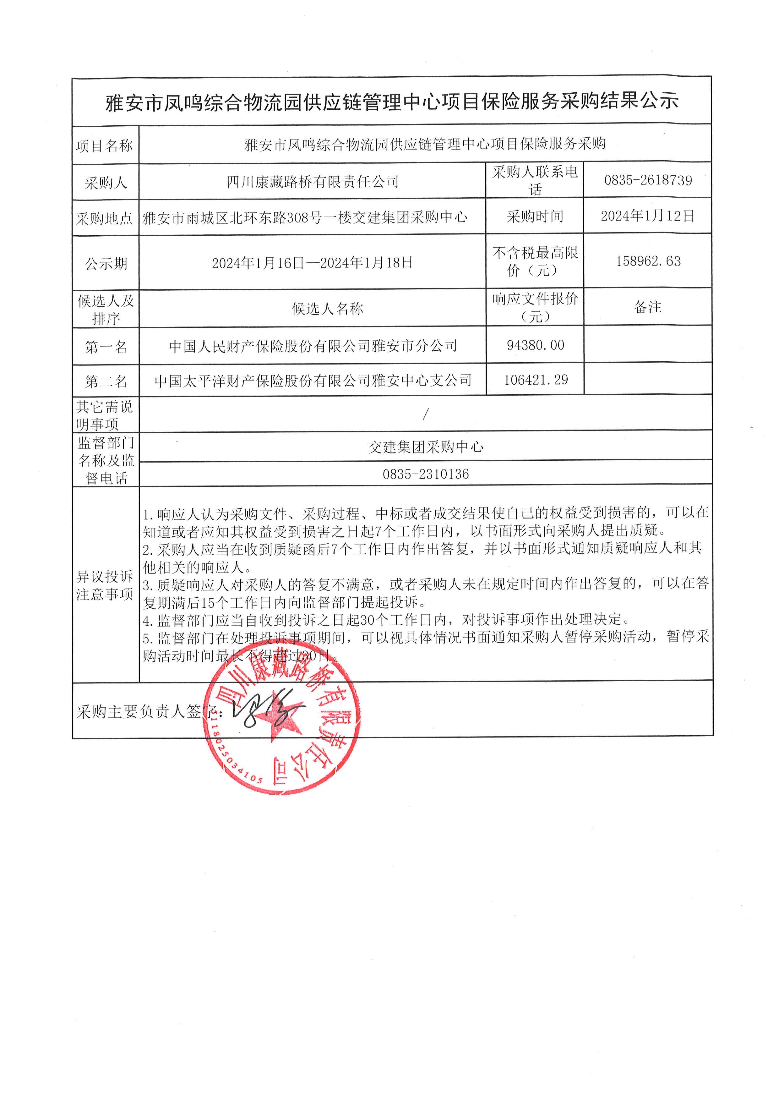四川康藏路橋有限責(zé)任公司雅安市鳳鳴綜合物流園供應(yīng)鏈管理中心項目保險服務(wù)采購結(jié)果公示