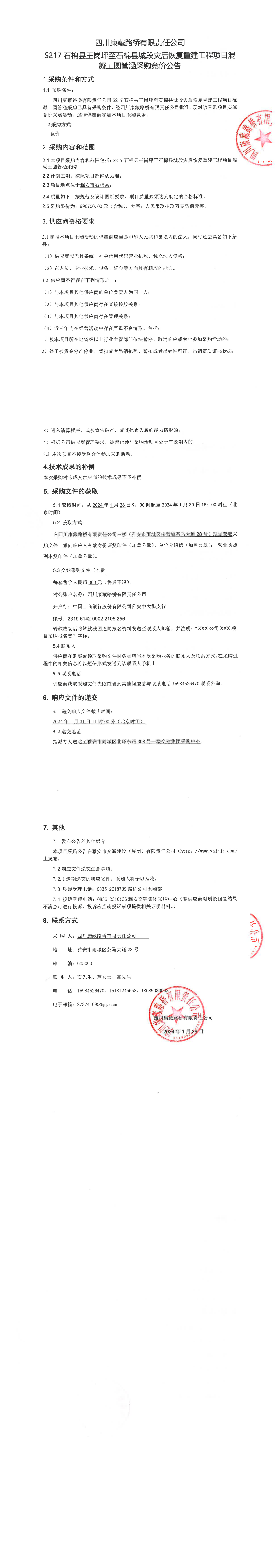 四川康藏路橋有限責(zé)任公司S217石棉縣王崗坪至石棉縣城段災(zāi)后恢復(fù)重建工程項(xiàng)目混凝土圓管涵采購競(jìng)價(jià)公告