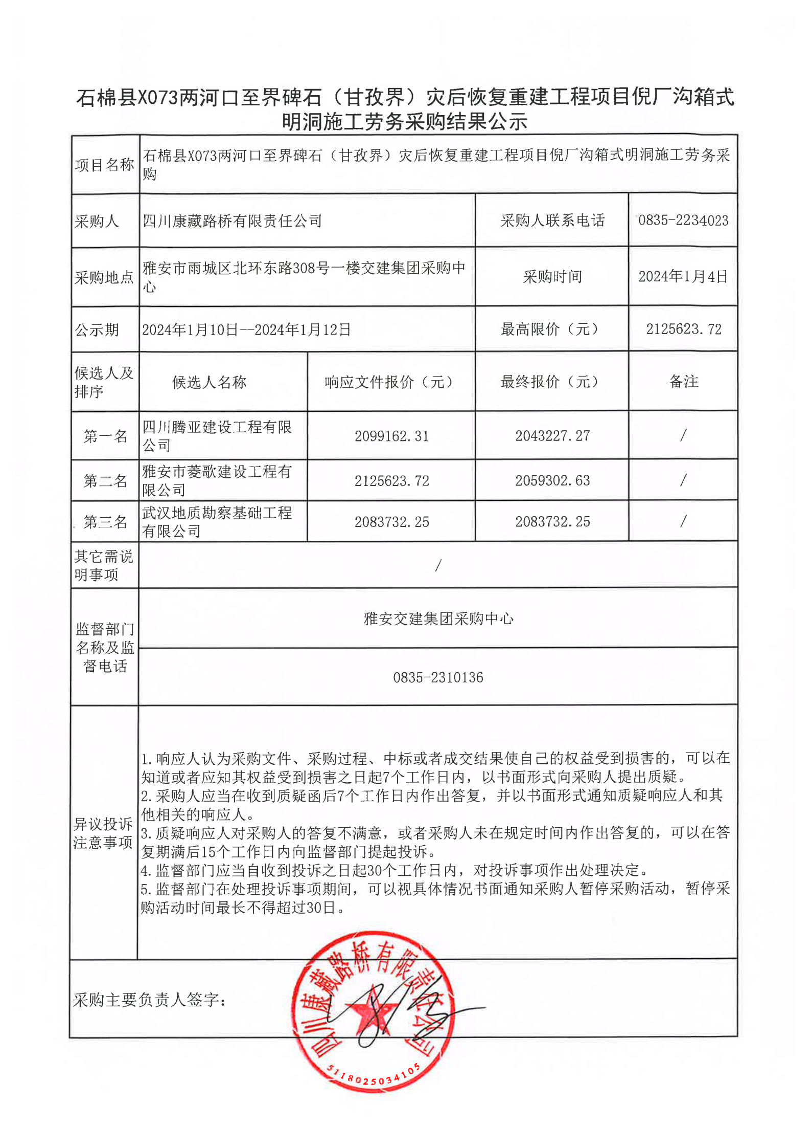 四川康藏路橋有限責任公司石棉縣X073兩河口至界碑石(甘孜界)災(zāi)后恢復(fù)重建工程項目倪廠溝箱式明洞施工勞務(wù)采購結(jié)果公示