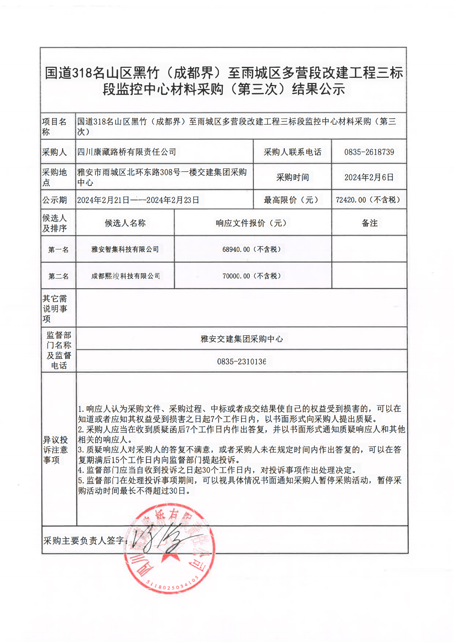 四川康藏路橋有限責(zé)任公司國(guó)道318名山區(qū)黑竹(成都界)至雨城區(qū)多營(yíng)段改建工程三標(biāo)段監(jiān)控中心材料采購(gòu)(第三次)結(jié)果公示
