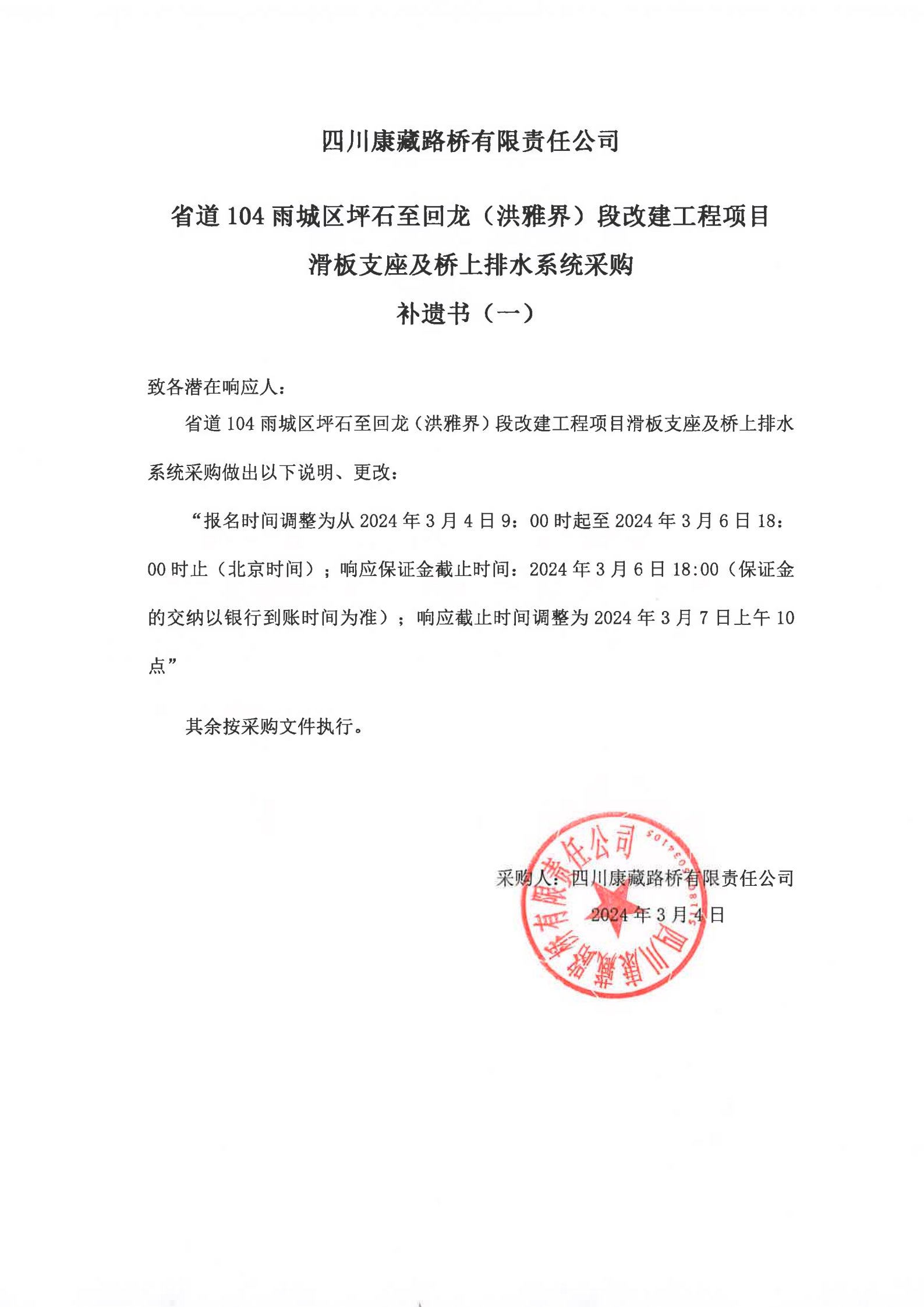 四川康藏路橋有限責(zé)任公司省道104雨城區(qū)坪石至回龍(洪雅界)段改建工程項(xiàng)目滑板支座及橋上排水系統(tǒng)采購(gòu)補(bǔ)遺書(shū)(一)