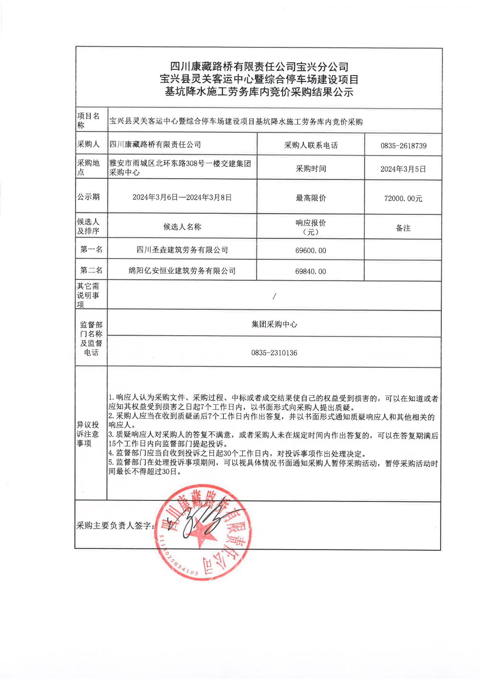 四川康藏路橋有限責(zé)任公司寶興分公司寶興縣靈關(guān)客運(yùn)站中心暨綜合停車場建設(shè)項(xiàng)目基坑降水施工勞務(wù)庫內(nèi)競價(jià)采購結(jié)果公示