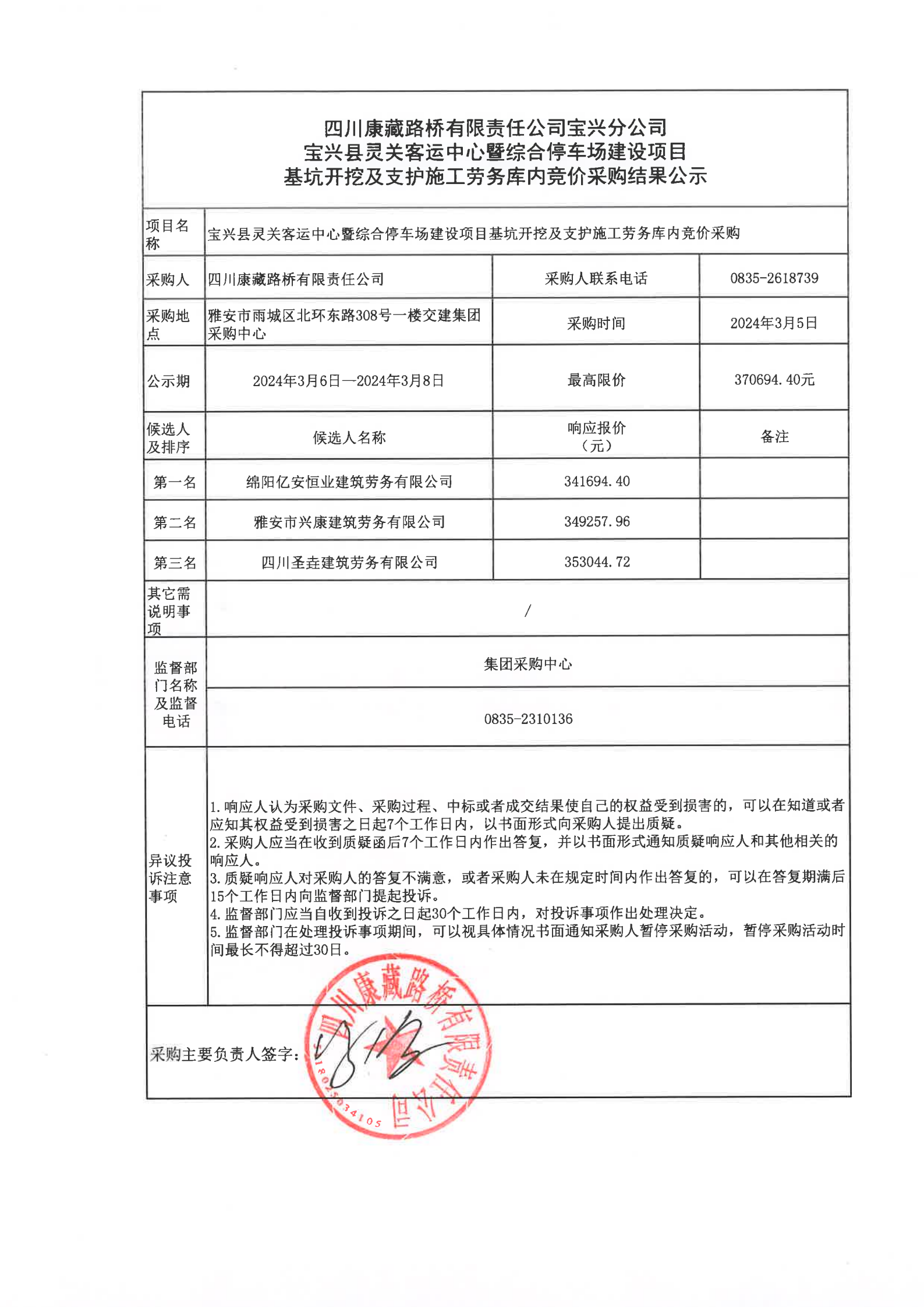 四川康藏路橋有限責任公司寶興分公司寶興縣靈關(guān)客運中心暨綜合停車場建設項目基坑開挖及支護施工勞務庫內(nèi)競價采購結(jié)果公示