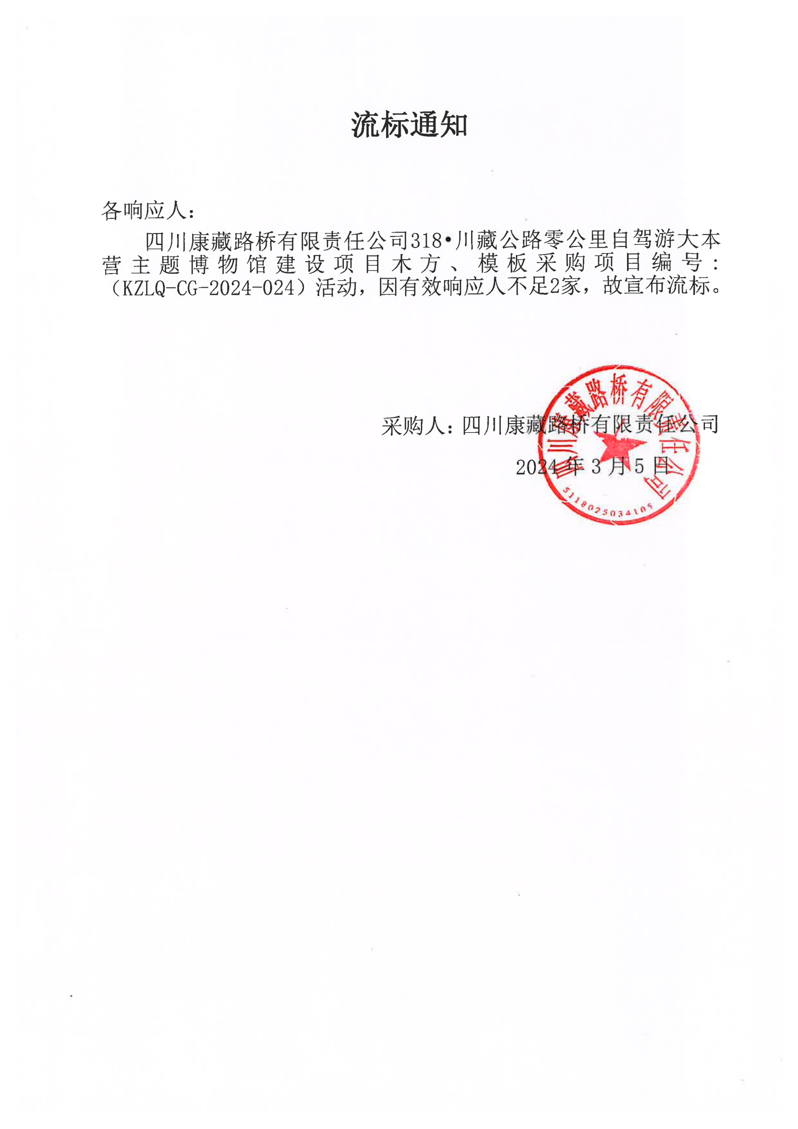 四川康藏路橋有限責(zé)任公司318·川藏公路零公里自駕游大本營(yíng)主題博物館建設(shè)項(xiàng)目木方、模板采購(gòu)流標(biāo)通知
