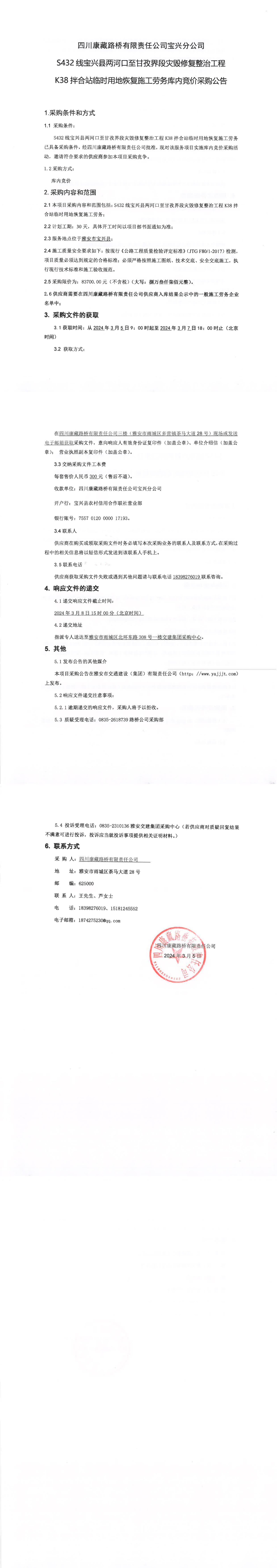 四川康藏路橋有限責任公司S432線寶興縣兩河口至甘孜界段災(zāi)毀修復整治工程K38拌合站臨時用地恢復施工勞務(wù)庫內(nèi)競價采購公告